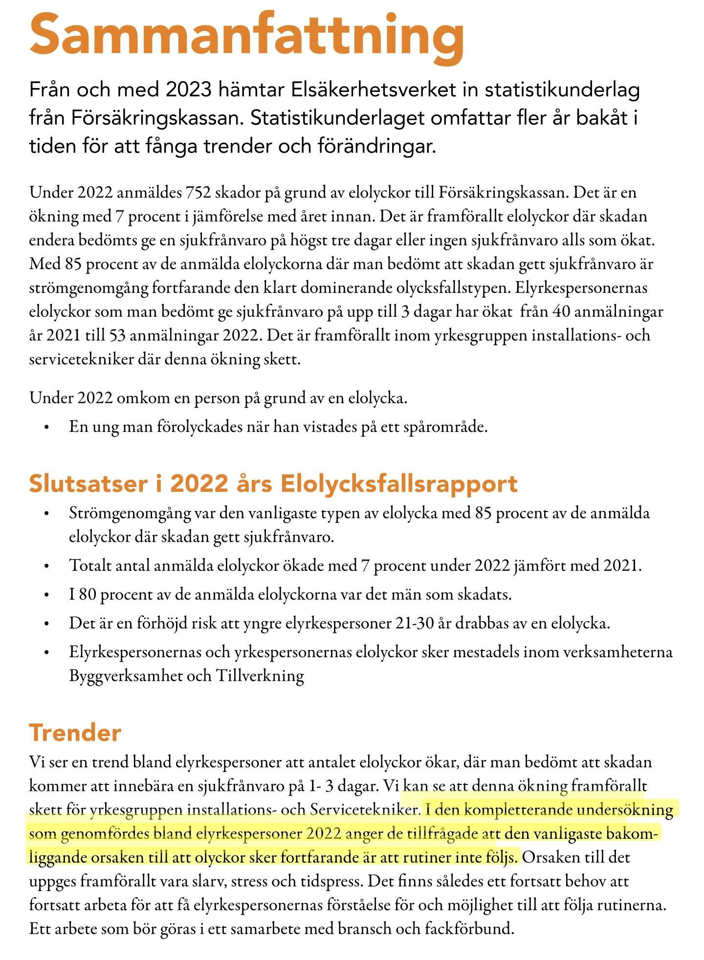 En uppdatering. Det var en dödsolycka förra året, som skedde på spår. De flesta olyckor, enligt elektrikerna själva beror på fel i deras utövning.