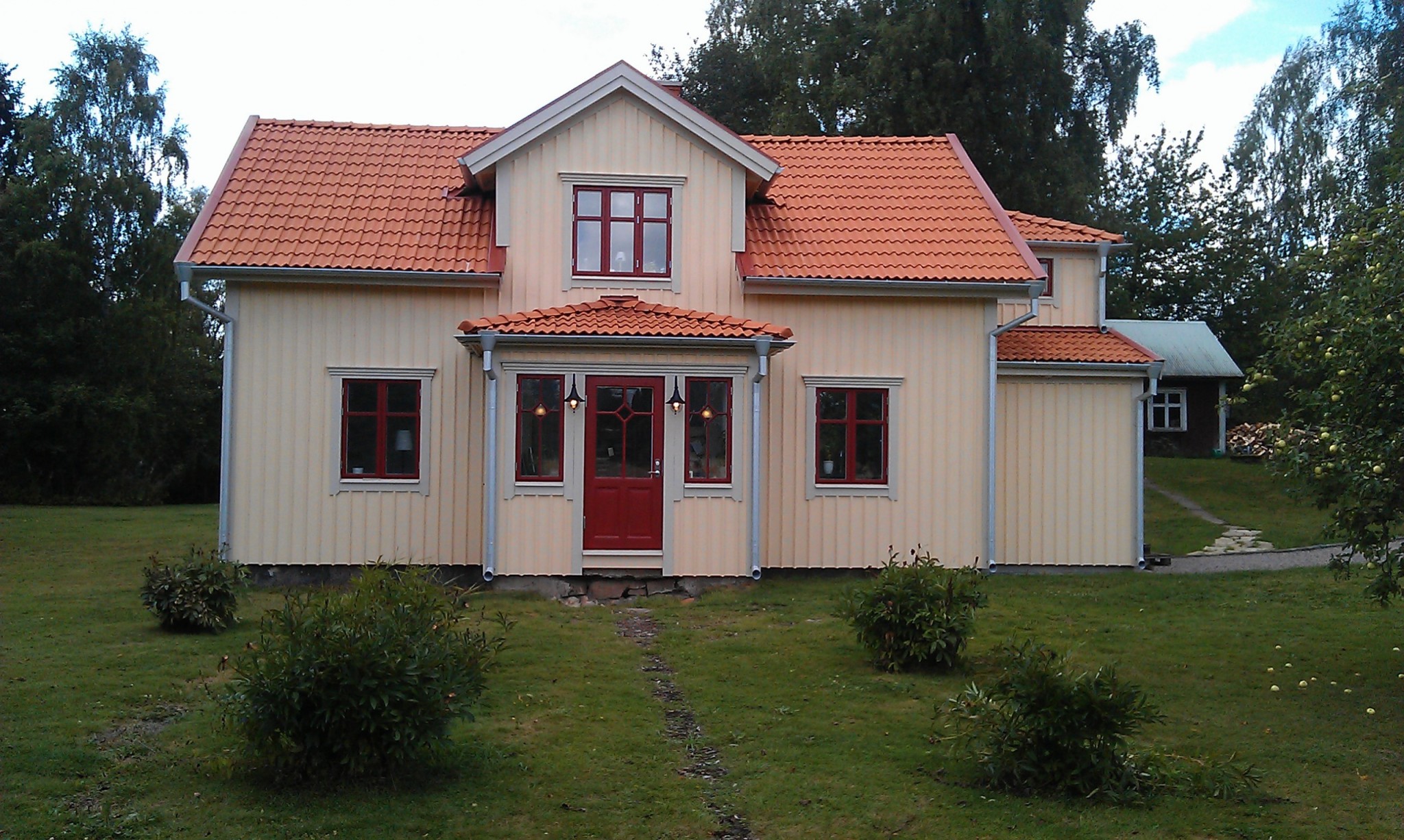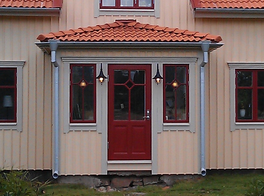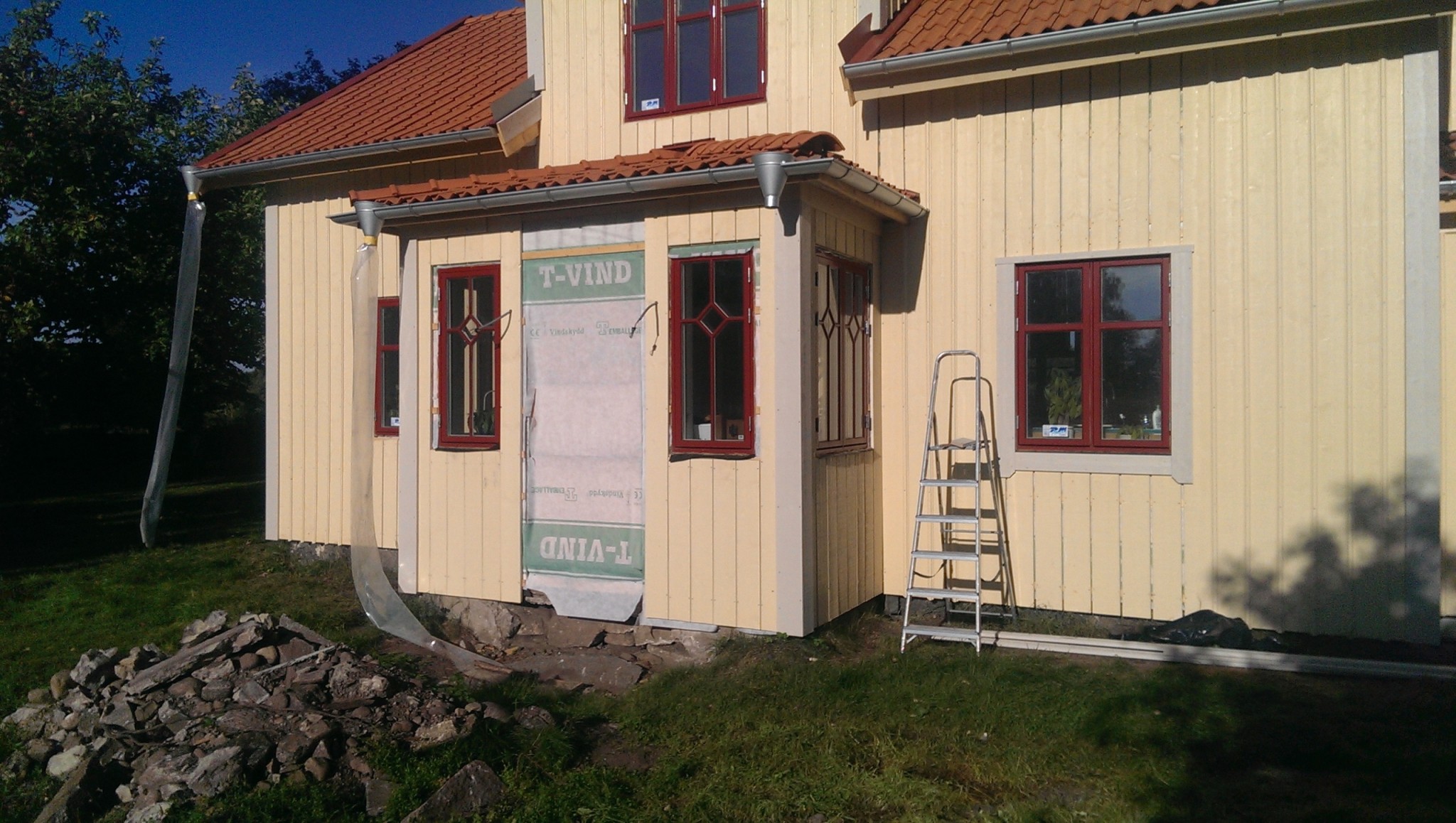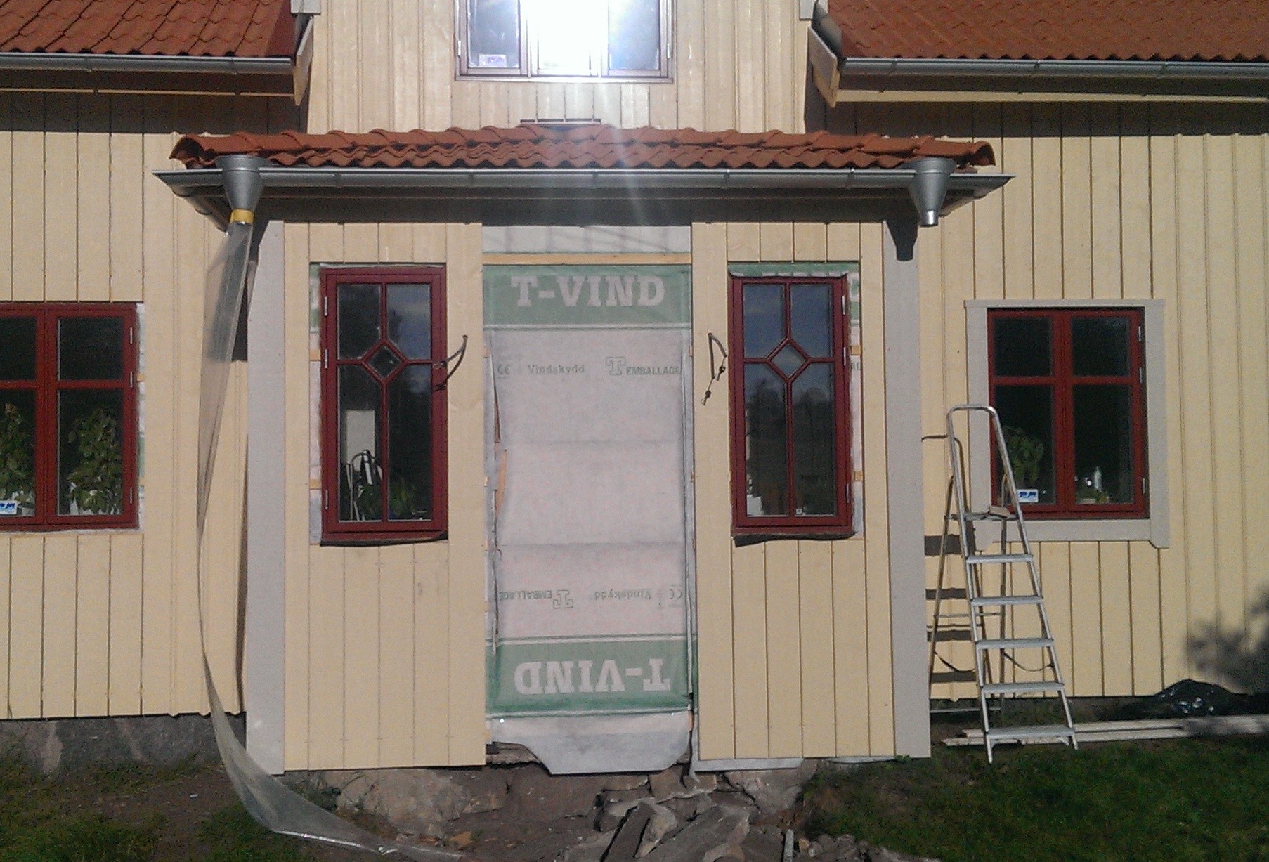 En annan fundering som hänger ihop med detta är hur vi ska göra över dörr och fönster, vi ska ha fönsterkrön och de går ut lite vid sidorna av fodren, men hur gör man över dörr och fönstren? Ett helt krön som sträcker sig hela vägen?