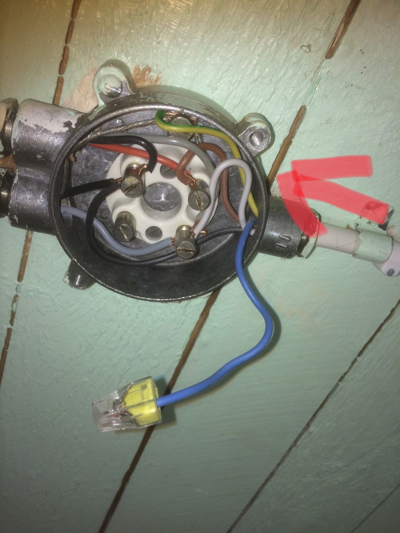 I den nya dosan kommer det från höger in en kabel med en svart och en grå tråd samt en avskalad fintrådig jord. Denna kabel är gammal befintlig och det är ingående ström från proppskåpet. Den nya ditsatta kabeln går ut till vänster och innehåller 5 trådar (utgående ström), varav brun och blå är bortkopplad. Med brun är ikopplad i den gamla dosan dit den nya kabeln går. Blå är helt bortkopplad.