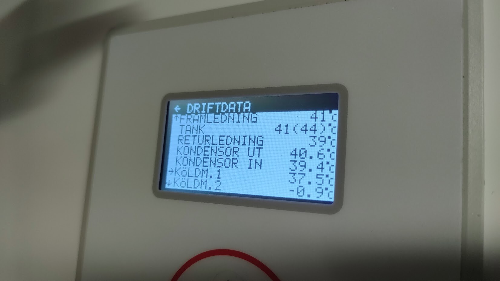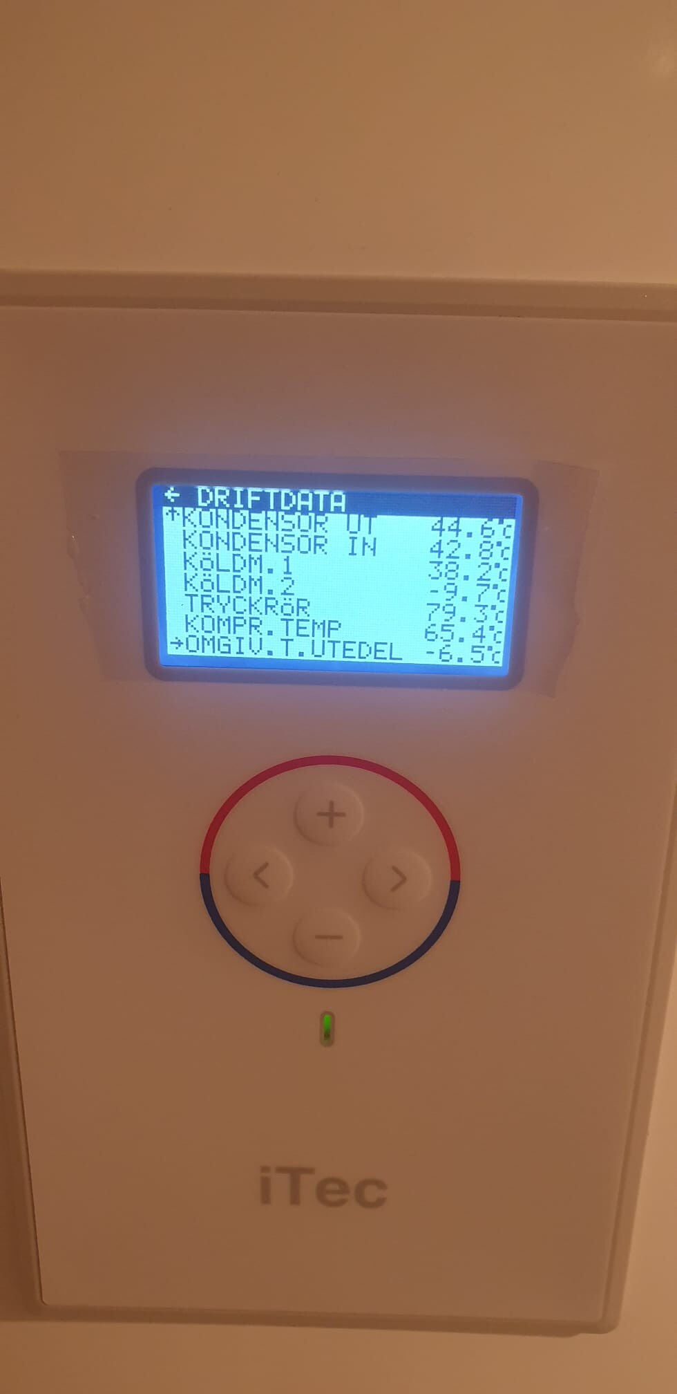 Den har ju inverter och den ligger på beräknad framledning så kompressorn borde inte gå på högsta effekt där.H hempularen skrev:NU gissar jag en del baserat på bilden med temperaturer. Det ser ut som det är -6,5 grader vid utedelen, samtidigt som ute temperaturen är .-8. Kanske lite märkligt. Köldmediet verkar vara på -9,7 när det kommer ut, värms till -6,5 av uteluften. Jag har för mig att skillnaden skall vara i storleksordningen 7 grader. Här är det bara 3 grader. Kan ev. vara en indikation på att något är fel.