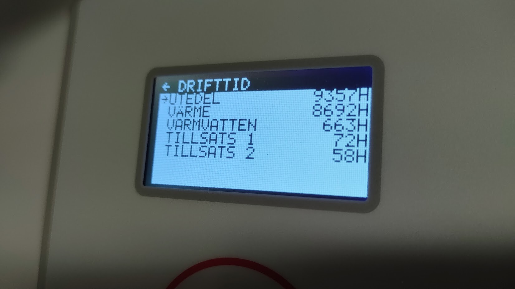 Tack för svaret, det ser ut som att din elförbrukning verkar ligga på en bra nivå mha denna lvvp, speciellt med tanke på storleken av huset jämfört med vårt. Jag bifogar en bild av vår drifttid, ser ut som att tillsatsvärmen har varit lika aktiv som varmvatten 🤔 Siffrorna i inställningen skiljer sig men jag vet ej om jag vågar ändra några siffror då installatören sa att jag ej skulle. Vi bor i Åmål och utedelen ligger i husets södra del.P poba53 skrev:Jag har en Thermia iTec Eco Total EQ 8kW med 60 liter bufferttank installerad och i bruk från 20230215, Mitt hus är på 185m2 + 10m2 verkstad där innedelen är placerad. Vi är 2 pensionärer med bottenvåning på 120m2 och värme satt till +22 och 65m2 övervåning med +18 i tre sovrum och allrum med +20. Övervåningen har Danfoss ECO termostater som fungerar perfekt. Innan värmepumpen hade vi elpanna och varmvattenberedare och vanliga vattenburna element. Förbrukning de närmaste åren innan värmepumpen varierade årsförbrukningen mellan 19000-22000 kWh. Under 2024 var förbrukningen 8100kWh. Spillvärmen från kopparrören i verkstaden till utedelen värmer till ca 17C. Nu har jag provat mig fram till lagom isolering av rören för denna innetemperatur. Tidigare värmdes detta rum med ett 500W elelement. Kolla mina bilder för förbrukning och driftsdata. Förbrukningen tills nu under februari blir högre än förra året. När yttertemperaturen är under -10C går tillsatsvärmen igång. Av driftstiden på displayen är 24h från instalationdagarna då innedelen gick utan ytterdel. Jag bor strax norr om Göteborg och ytterdelen står på husets sydsida