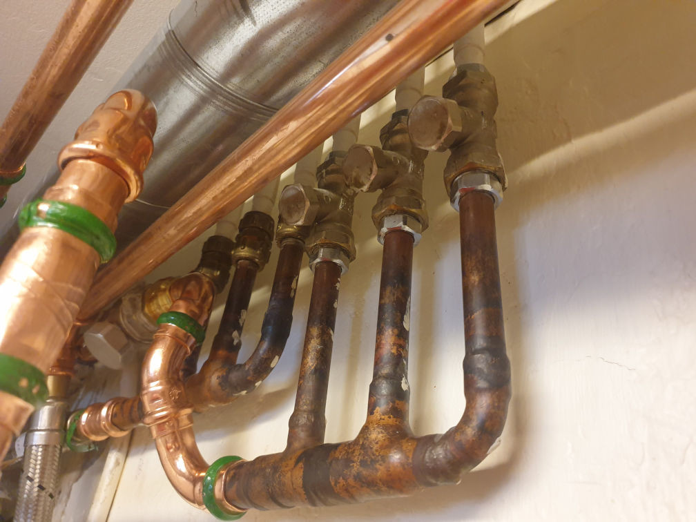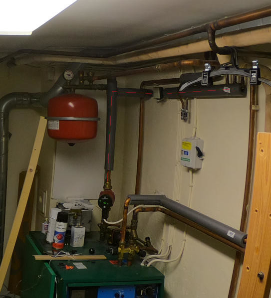 På andra bilden kan man "med lite vilja" se hur det såg ut tidigare, cirkulationspump, givare, högra stammen.