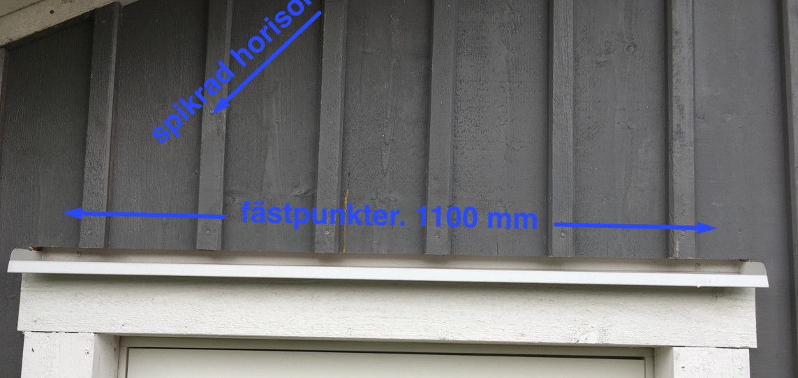 Har lockpanel med smala lock. (Dessutom har jag en taklutning där, relativt ont om plats på ena sidan så utbudet av potentiella tak är begränsat). Min tanke är att passa in och förmåla två brädor som jag fäster mellan locken och sen skruvar entrétaket i dessa. Dels så kan jag dra in brädorna i spikraderna jag ser, dela för att få taket på rätt avstånd från fasaden då alternativet ändå är nån form av distans för att hamna utanför locken.