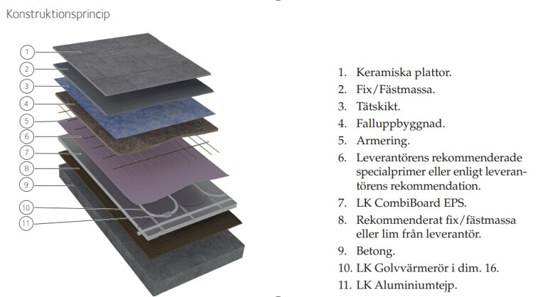 Bila bort överbetongen samt ta bort singel och mineralull. Det är ca 10cm material. Jag limmar istället på 70mm Combi EPS skivor från LK på betongplattan som jag lägger rör i för golvvärme. Sedan följer jag/platssättare stegen LK beskriver för beläggning med keramiska plattor.
