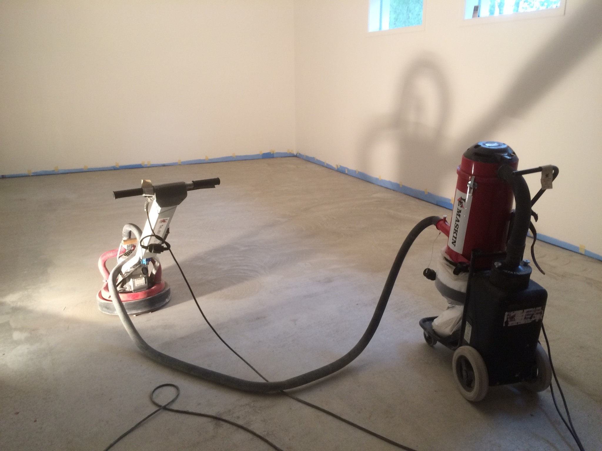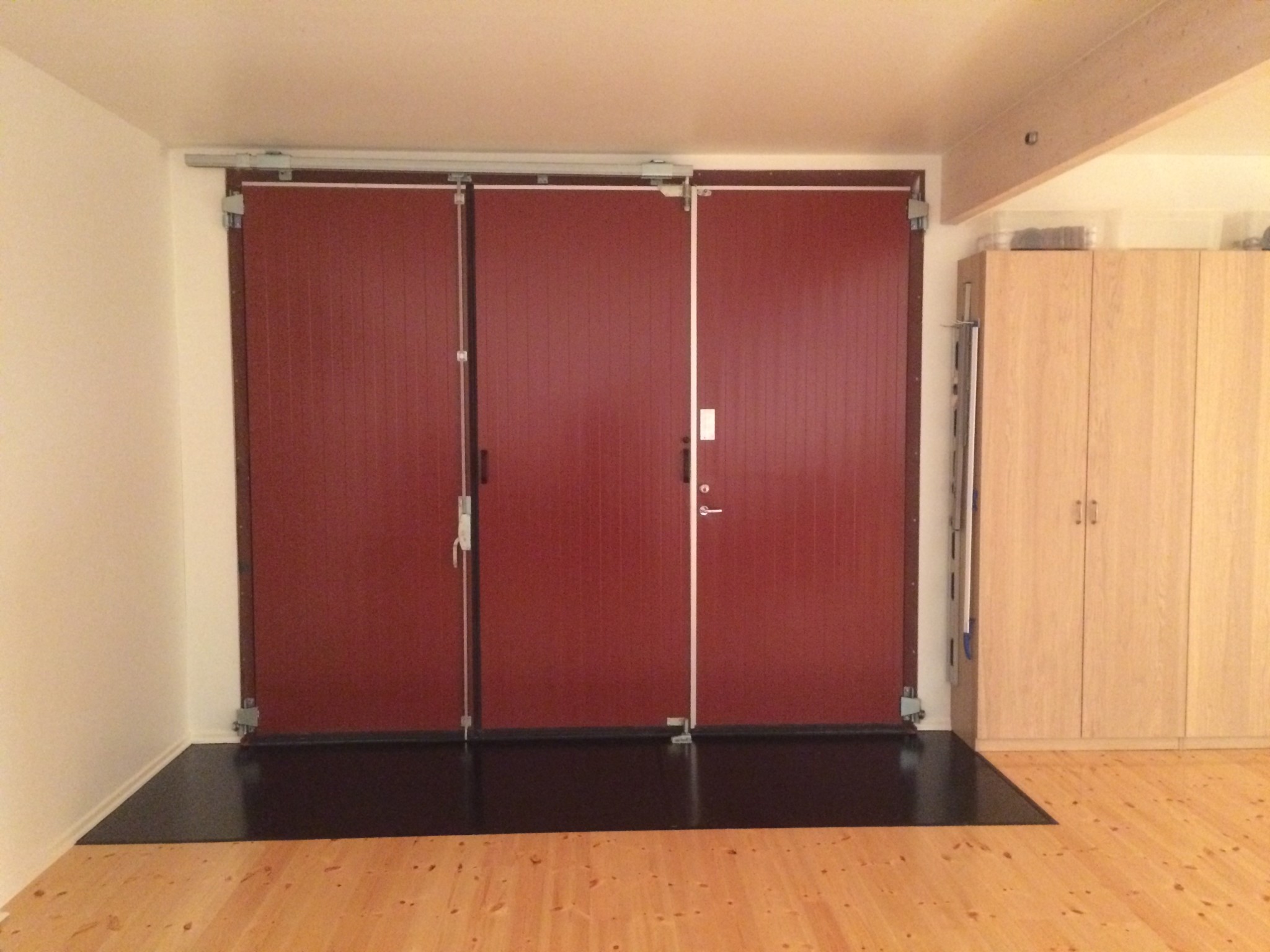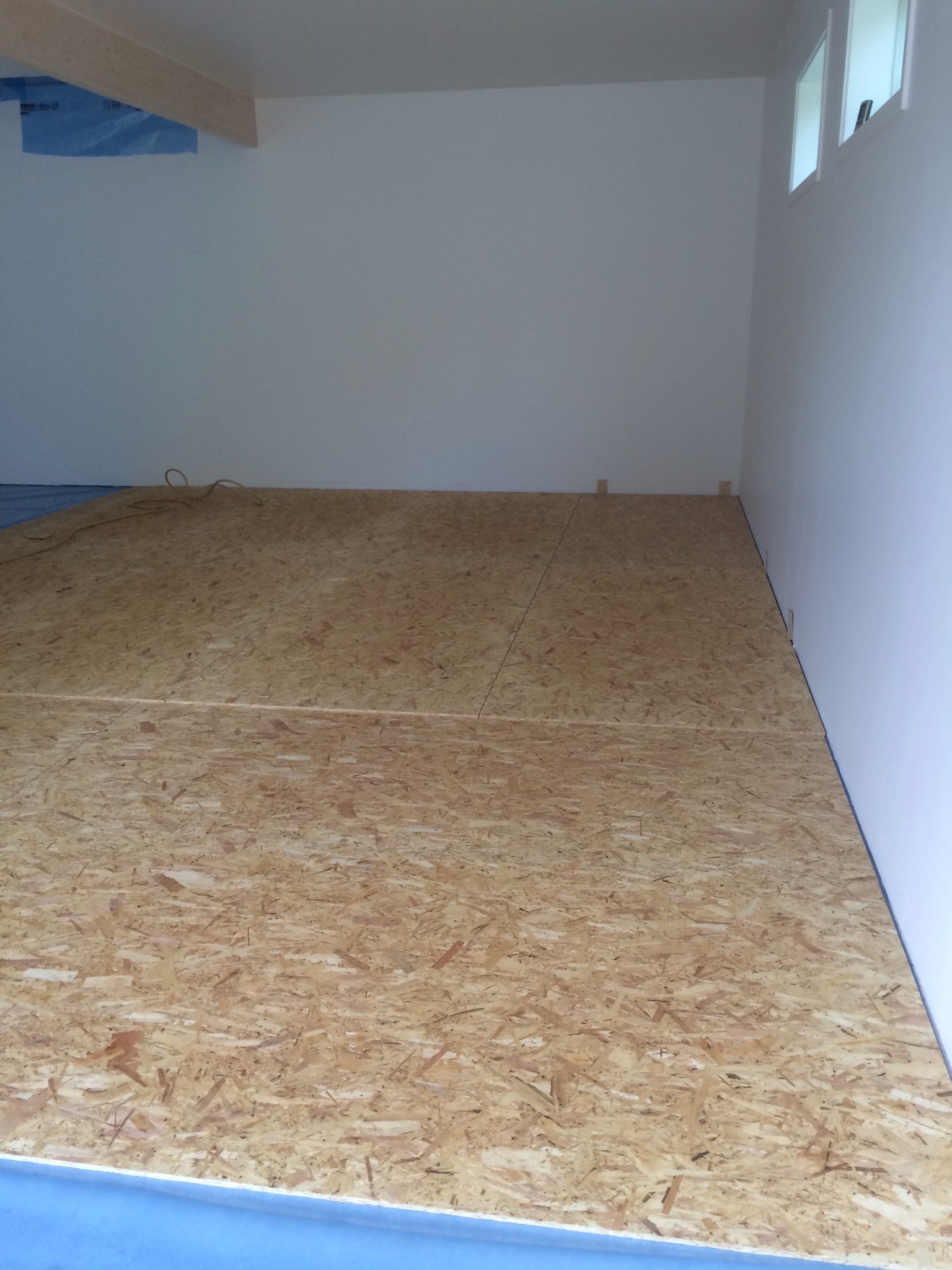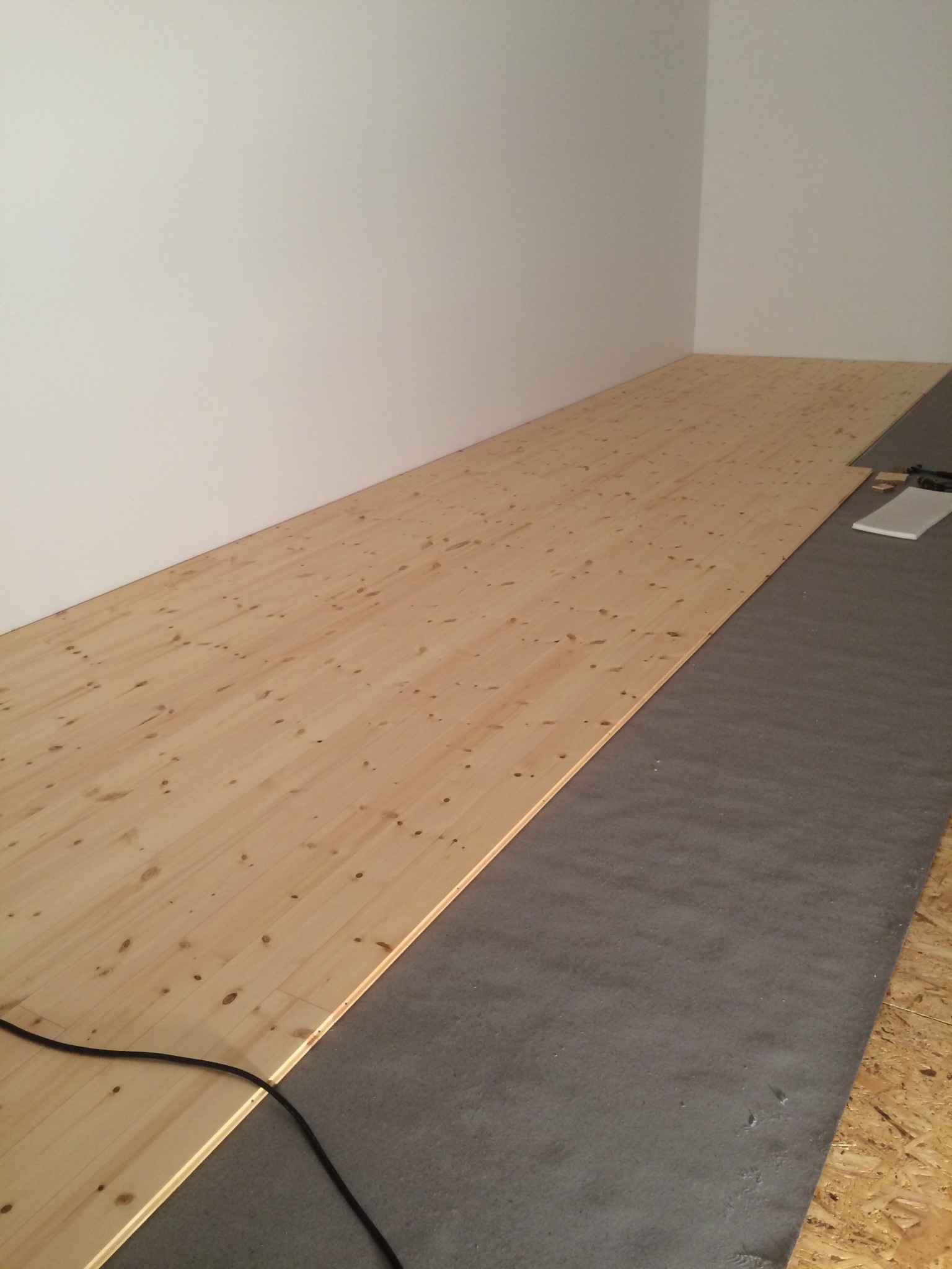 Jag ville ha ett flytande trägolv, inte fastsatt i betongplattan. Jag hyrde en golvslip och slipade av betonggolvet. Sedan lade jag byggplast och för att få något att skruva i så lade jag OSB-skivor (de är oftast planare än plywood och billigare). Jag ville komma upp i exakt rätt höjd för att ligga i nivå med porten. Därav lade jag tre lager OSB med förskjutna skarvar som jag häftade ihop med klammerpistol. Sedan lade jag ett lager lump-papp och slutligen ett 20mm tjockt furugolv. Det är skruvat tätt i sponten med de skruvar som BASECO säljer med golvet samt limmat i ändsponten. Slutligen lackade jag golvet själv med Tre Stjärnor golvlack (Jotuns golvprodukter). Det är fyra lager med en lätt slipning emellan. Jag rollade golvet och varje lager tog 2 timmar. Jag tycker att golvet är väldigt komfortabelt. Golvvärme behövs inte, skönt att stå eller sitta på och om man tappar ett verktyg så skadas det inte. Däremot så blir det ju givetvis ett märke i golvet men det är ju en verkstad. Rikt/plan-hyveln väger 275kg och bandsågen väger 250kg men de står stadigt och bra. Jag laddar upp lite fler bilder.