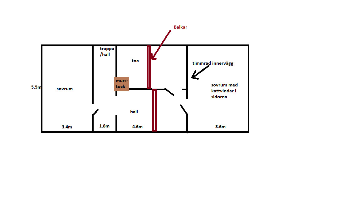 Oerhört tacksam för alla svar! JAg ska fota lite mer idag när jag röjt lite till då det va svårt att få till en bra bild igår.. Skissat på¨en en ritning som ger ett bättre humm om husets uppbyggnad.. Taket har lyfts på mitten nång gång på 40-talet och innefattar hela mittendelen av huset. Mellanväggarna till sovrummen bör ju hålla även ihop huset. Sedan är jag inte alls ute efter att ta bort denna balk utan att ersätta med något