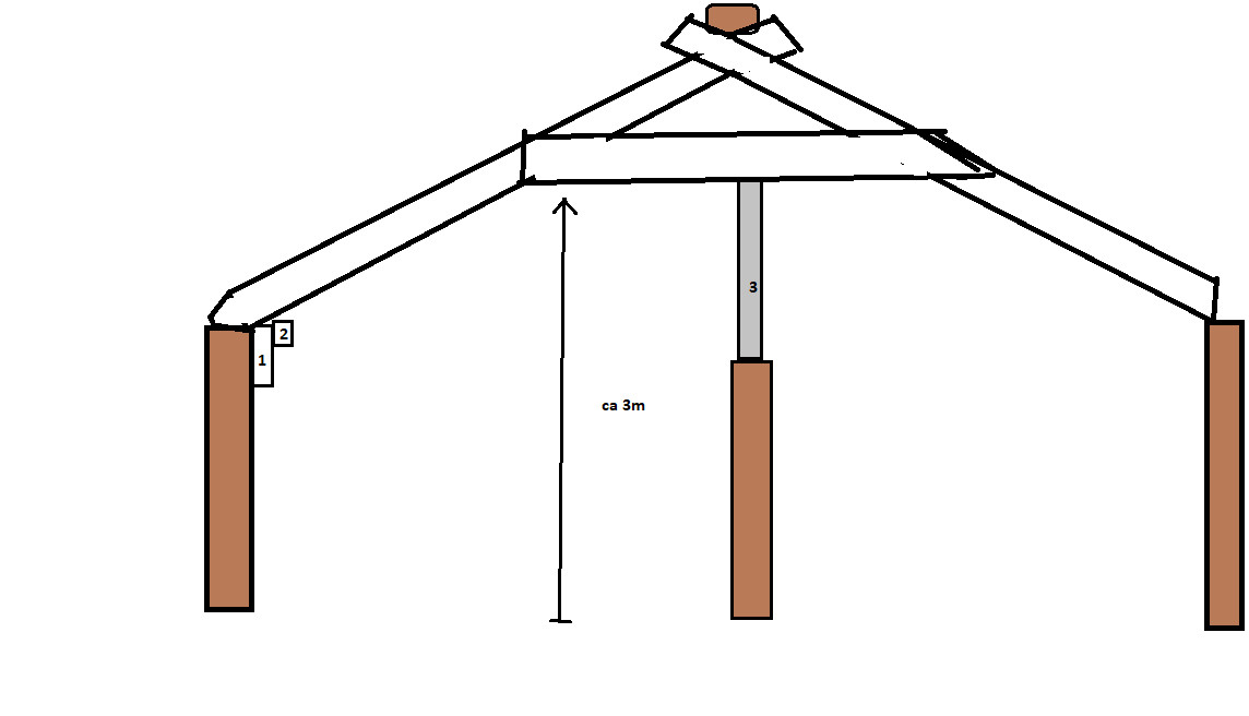 Jag har svårt att få överblick över problemet. Av fotot kan man ändå dra vissa slutsatser. Eftersom takbrädorna ligger i takfallets riktning fungerar ju bjälke nr 3 som en ås. Hur är det på andra sidan? Som @pjapen påpekar fungerar bjälke nr 1 som en hanbjälke, dvs håller ihop långsidorna.fast det är skumt att den verkar skarvad på mitten.
