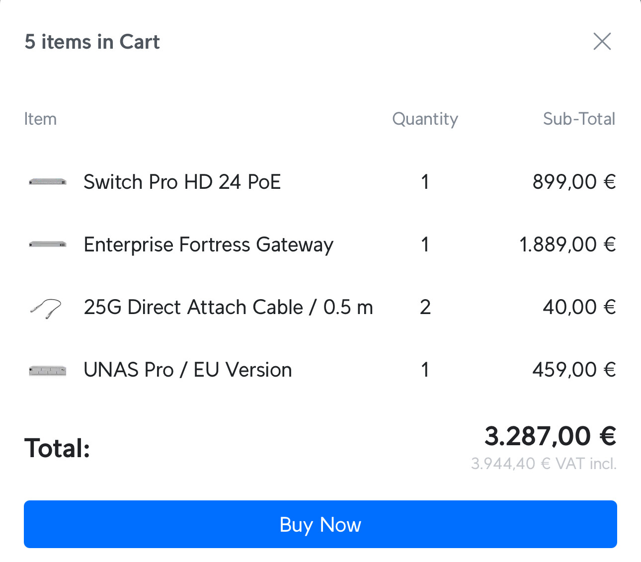 Mitt backbone här hemma är 10GBit/s fiber och jag har inte betalat några 20' för de enhetern
