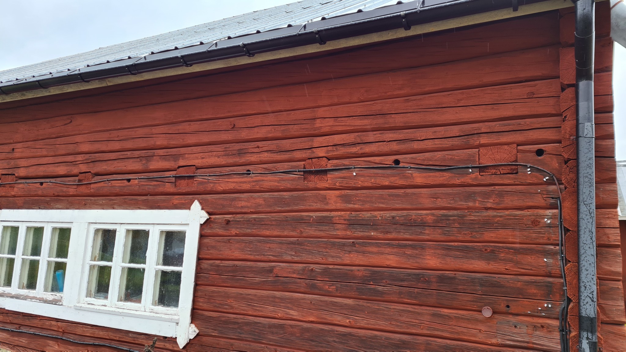 Det är nästan garanterat hela längden på bjälkarna, ingen skarv, då framsidan är timrad i hela stockar hela vägen.