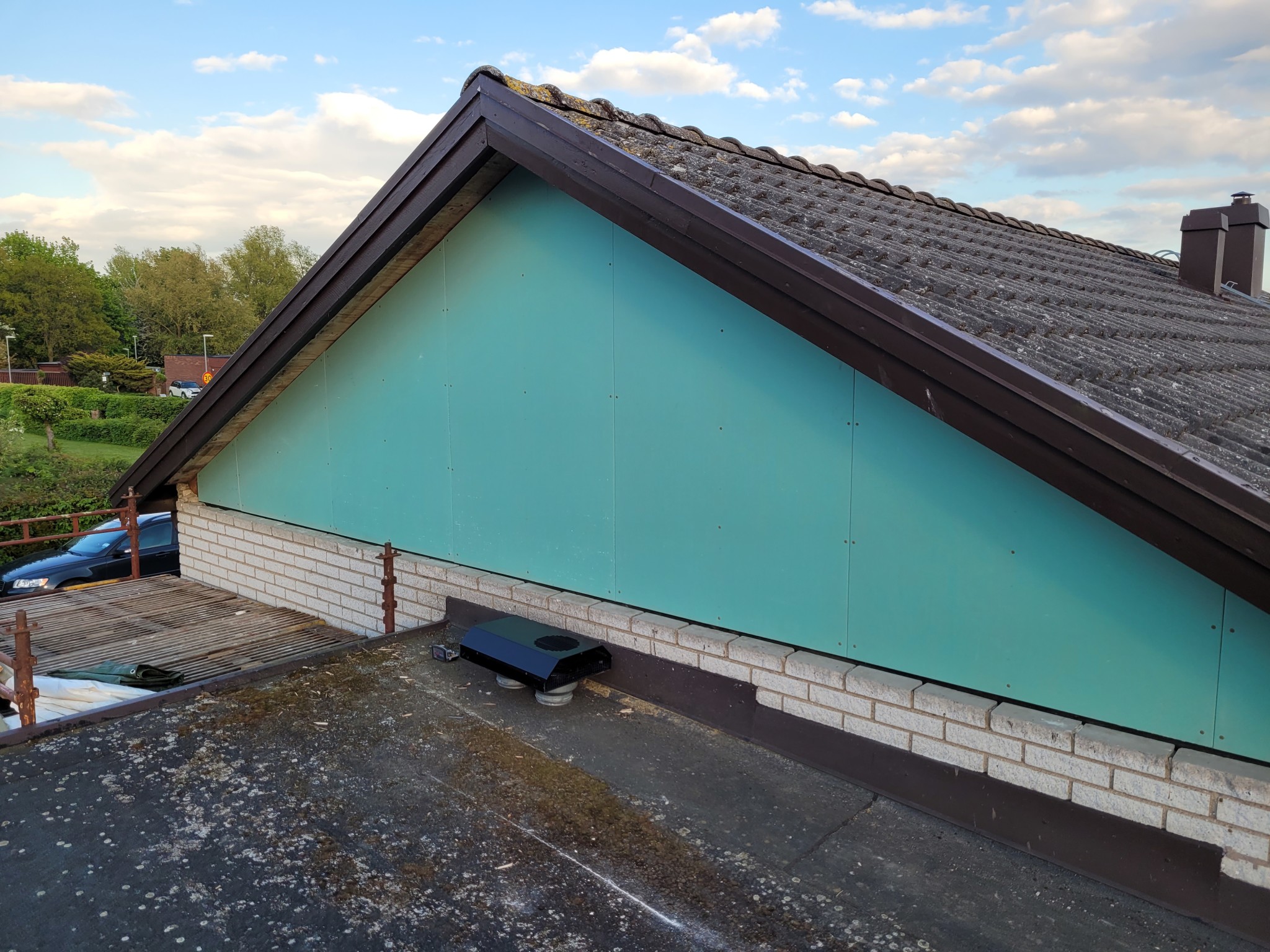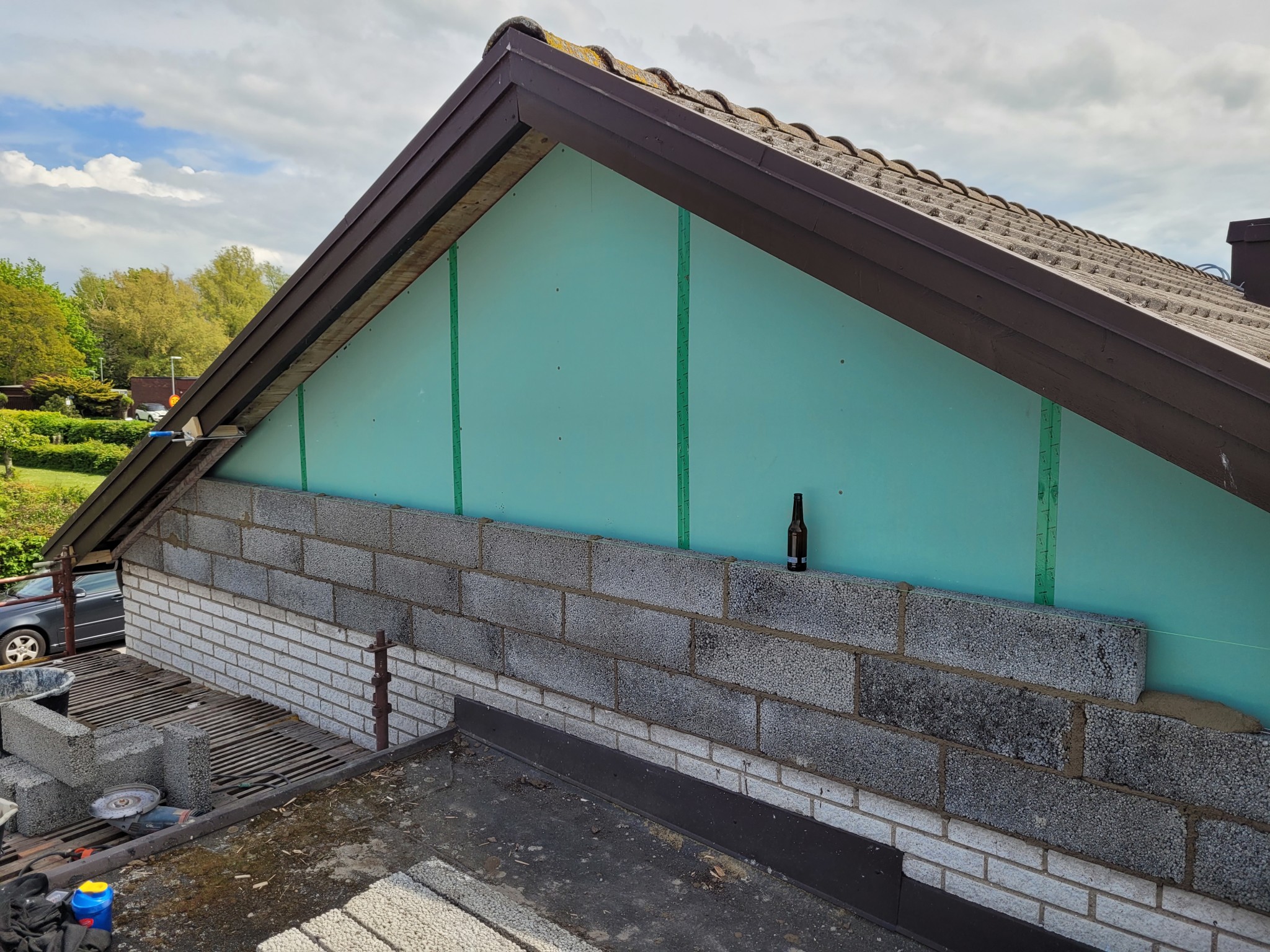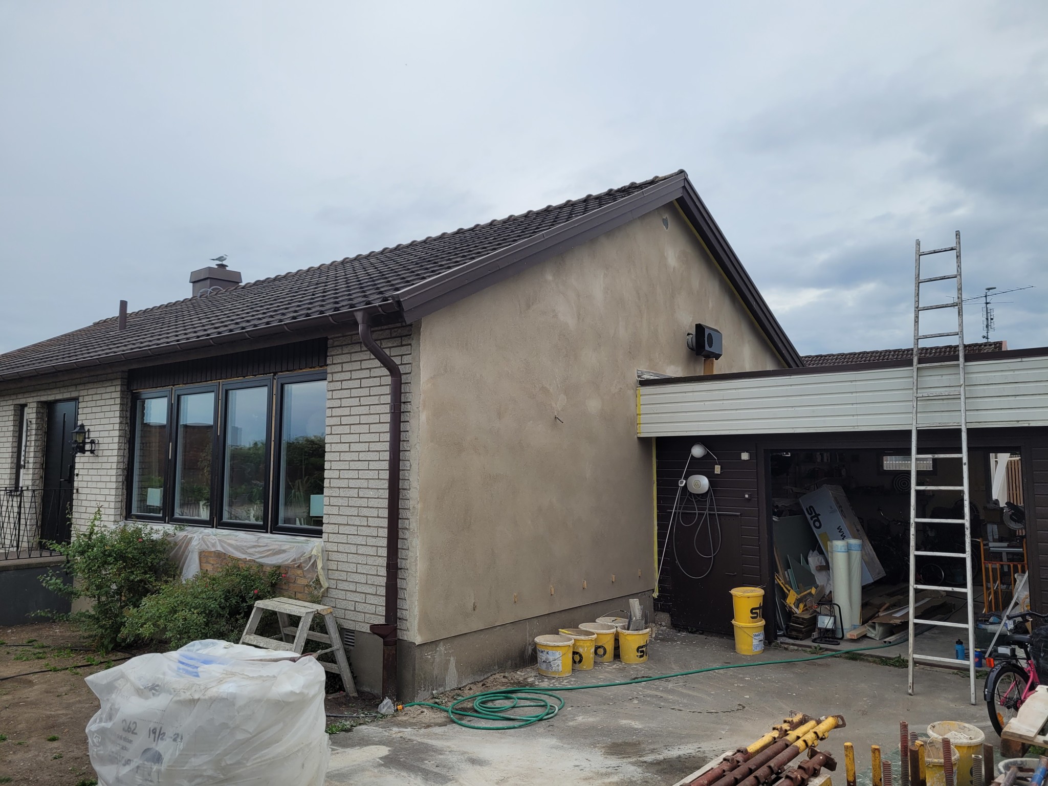 Vi ska putsa vårt mexitegelhus, och har tänkt ta bort panelen på gavelspetsen och putsa hela vägen upp. Hade en plan om att riva bort gaveln, regla upp på takstolen och sätta utegips, sedan mura gaveln med lecablock med luftspalt innanför.