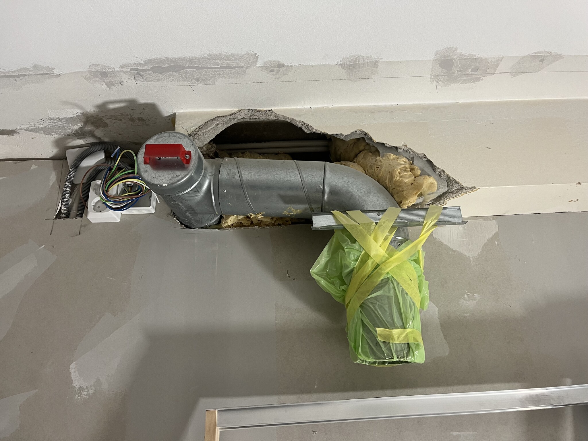 Så här ser nuvarande rör ut. Planen från början var bara att såga ut lite mer av den gamla kanalen (inaktiv idag) för att få plats med ett längre rör och välja spjäll då man inte får ha fläkt med motor. Sen visade det sig att kanalen har asbest i sig och jag är inte lika sugen på att såga i den. Nu tänker jag att jag istället låter röret gå rakt ut (där rensluckan sitter) genom täckskivan som ska få dölja kanal-kaoset med ett frånluftsdon för att behålla självdraget, och en separat kolfilterfläkt.