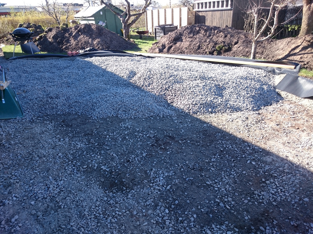 Jag förstår nu att makadam inte är det allra stabilaste materialet att bottna med och att det förmodligen hade blivit bättre om jag kört bort makadamen och ersatt det med ett riktigt förstärkningslager 0/64 eller något liknande.