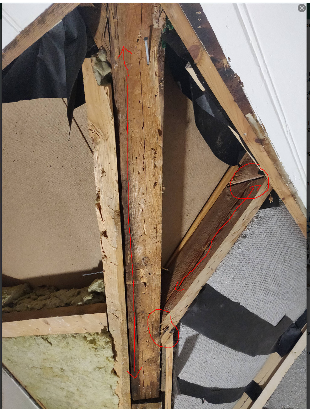 Ok. Bifogar en bild på vad jag tolkar som bärande och inte. Det jag tänkte förstärka är markerat med cirklar. Som jag tolkar det har man alltså dels spikat på reglar på båda sidor om takstolen samt "hängt" upp den i vindsbjälklaget med den högra balken som jag tänkte förstärka.