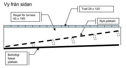 Men, som en extra säkerhet mot framtida takläckage funderar jag på lägga in ett nytt plåttak, nedsänkt mellan de nya reglarna som terassen ska vila på. Plåttaket kommer därmed att ligga dolt under terassens golv och fallet på det nya taket kommer att bli ca 6 cm/meter (se bild).
