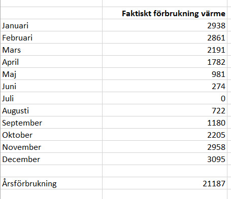 Från maj-september har vi haft en stadig förbrukning månadsvis på ca 750 kWh. Då låg vredet på pannan på ca 0,3 (vredet går från 0-10). Då hade vi en inomhustemp på ca 20 grader (och upp mot 25 grader de varmaste dagarna i somras). I oktober började det bli kallt så vi höjde vredet för att få upp värmen lite till ca 1 av 10. Nu är tempen inomhus ca 22,5 grader.