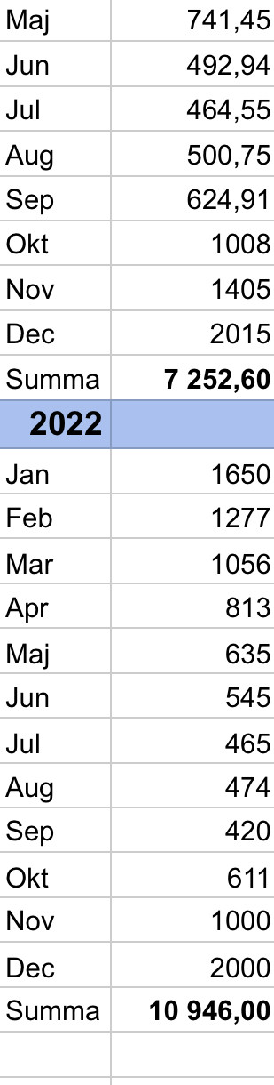 Förbrukning sedan maj 2021. Nov och Dec iår är uppskattat förstås