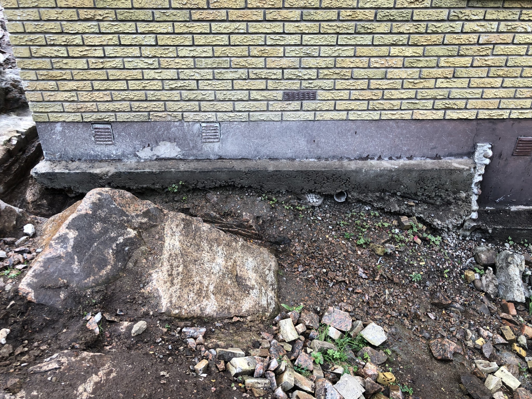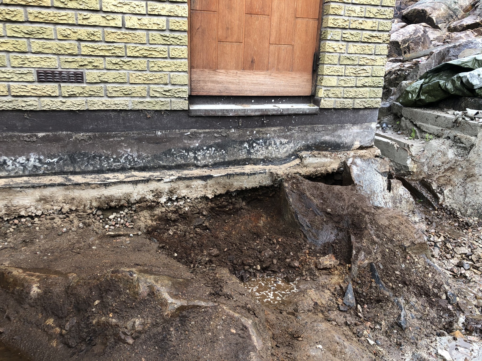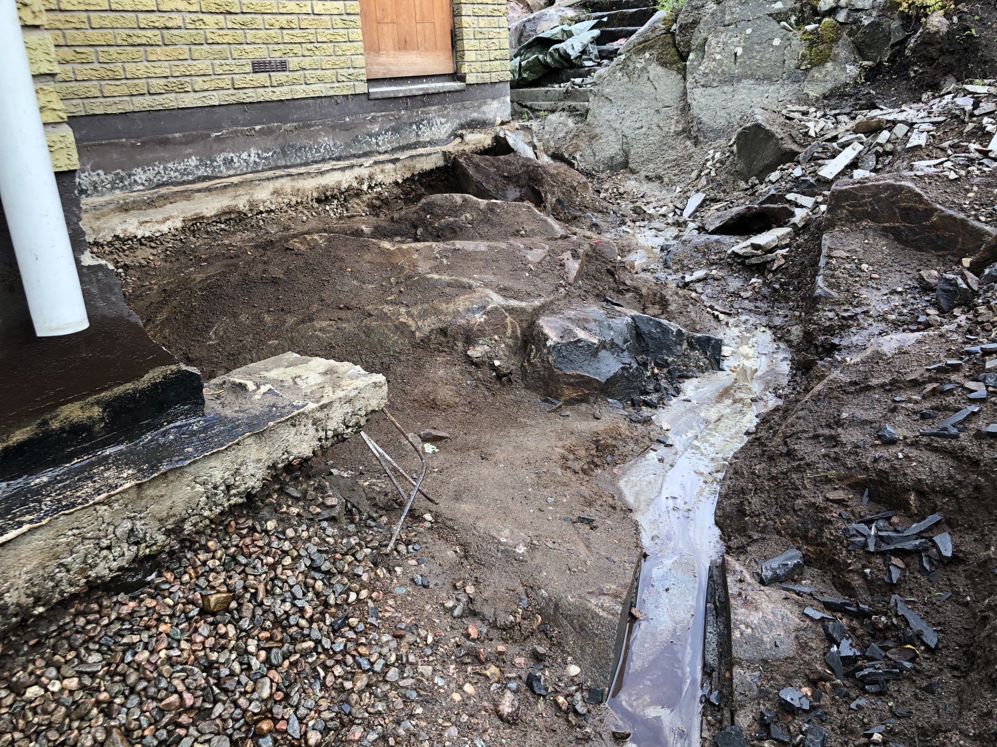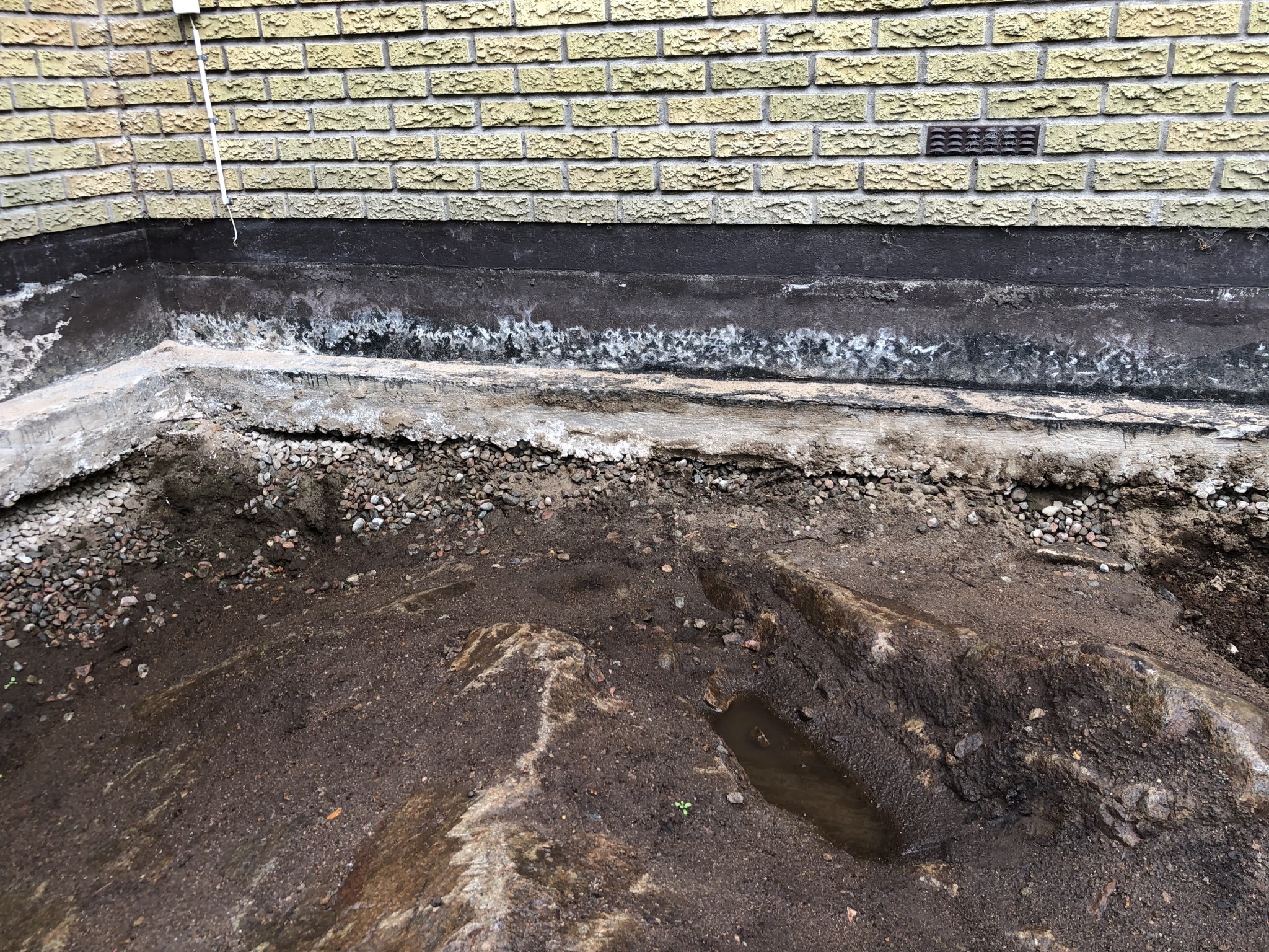 Vi håller på med ett dräneringsprojekt och det går skapligt. Huset står på berg som sluttar in mot väggen vid övre kortsidan. På den sidan har man för många år sedan gjutit mellan berget och huset, kanske ett försök att täta. Vattnet har dock runnit i stora mängder under betongen och in i krypgrunden, och sedan vidare över golvet i ett intilliggande källarrum. I krypgrunden var berget tidigare i dagen men nu är det fyllt med grus + plastat.