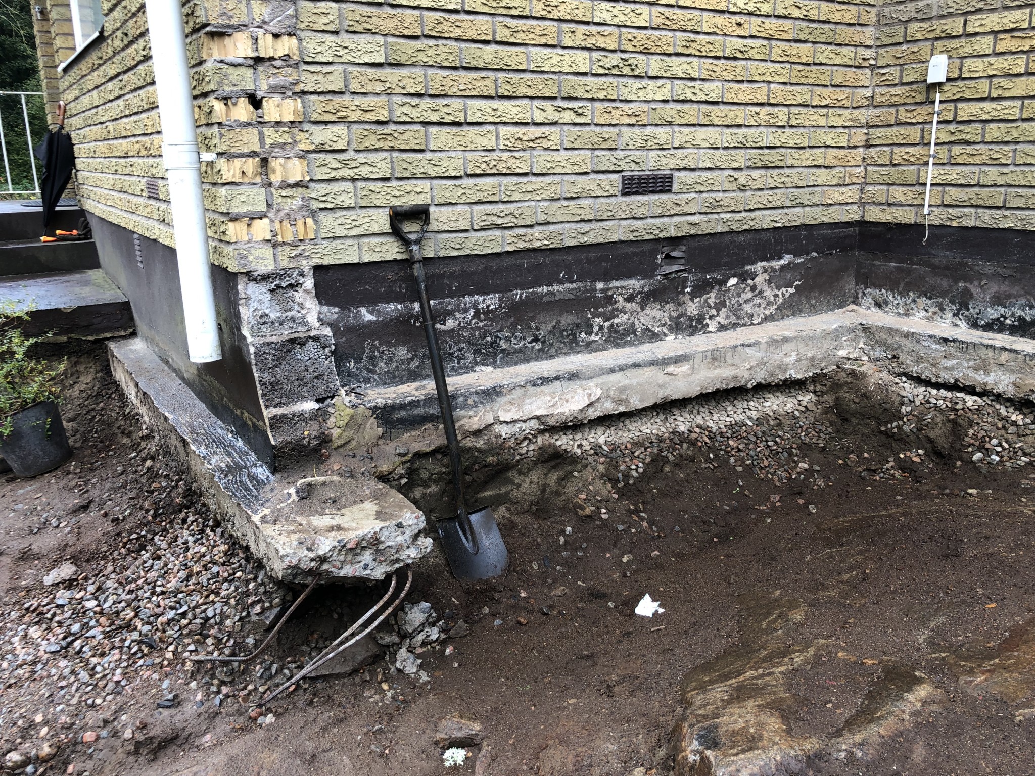Men när vi frilade grunden visade det sig att den har några rejäla skador vid hörnen. Betongen där var mycket porös och när jag började rensa ur visade det sig att det fanns mycket jord innanför. Också rätt mycket gråsuggor och daggmaskar... Själva grunden verkar i denna del av huset stå dels på berget, dels på en grusbädd (?). Nu har jag rensat så att jag ser hyfsat fräscht grus inne i hålen igen.