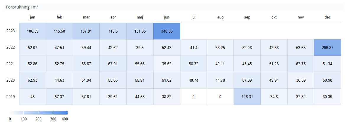 Har en mindre hyresfastighet där vattenföbrukningen stuckigt iväg rejält. Kan inte lista ut varför. Se graf nedan. Från december -22 har det dragit iväg rejält med en topp nu i juni på kring 6,5 ggr tidigare års genomsnitt.