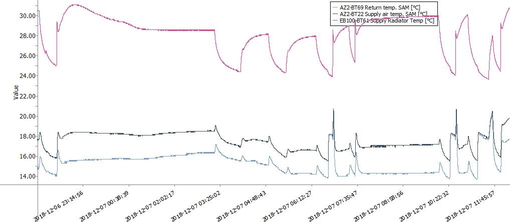 Bifogar graf på din fil där jag tagit med temperaturen på framledningstemperaturen röd, tilluftstemperaturen svart och returen på vattnet (sam40) blå som inte får gå under 10 för varning och 5 för avstängning. Du har en del svängningar men inte så farligt vid dessa temperaturer. Returen gick som lägst ner till 13 grader och då var det 4 grader ute. Fortsätt logga. Ska bli intressant att se när de har bytt ventilen. Dessutom blir det kallare nästa vecka.M May skrev: