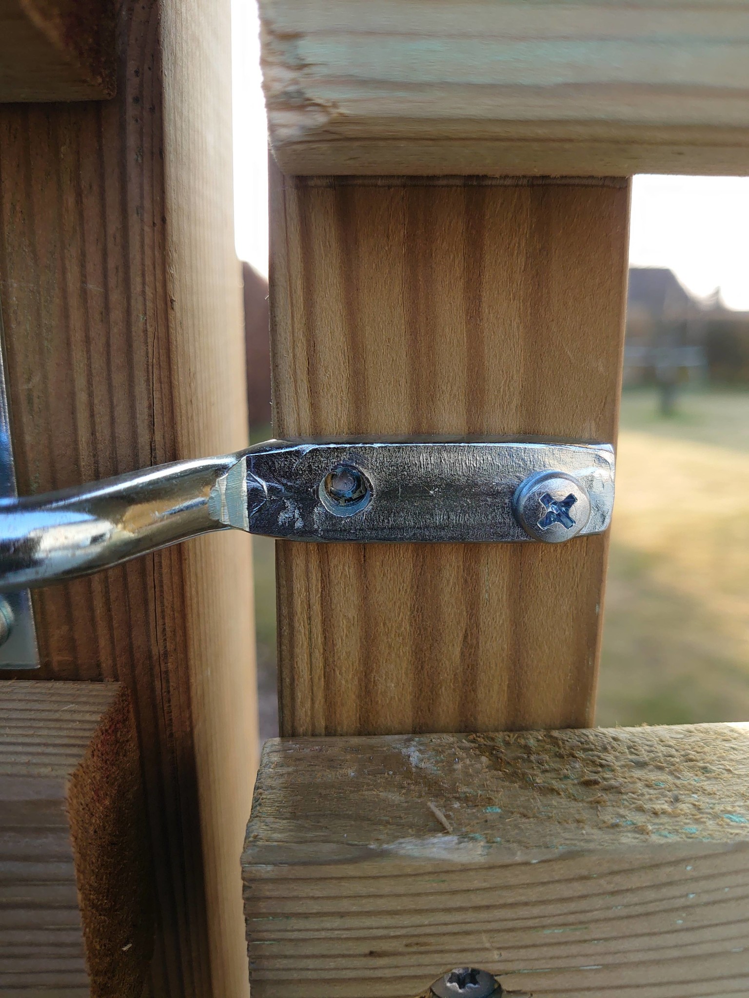 Ta en borr som är 0,5 större än hålet i beslaget, borra så att toppen av skruven blir jämn och får en liten försänkning av den stora borren.