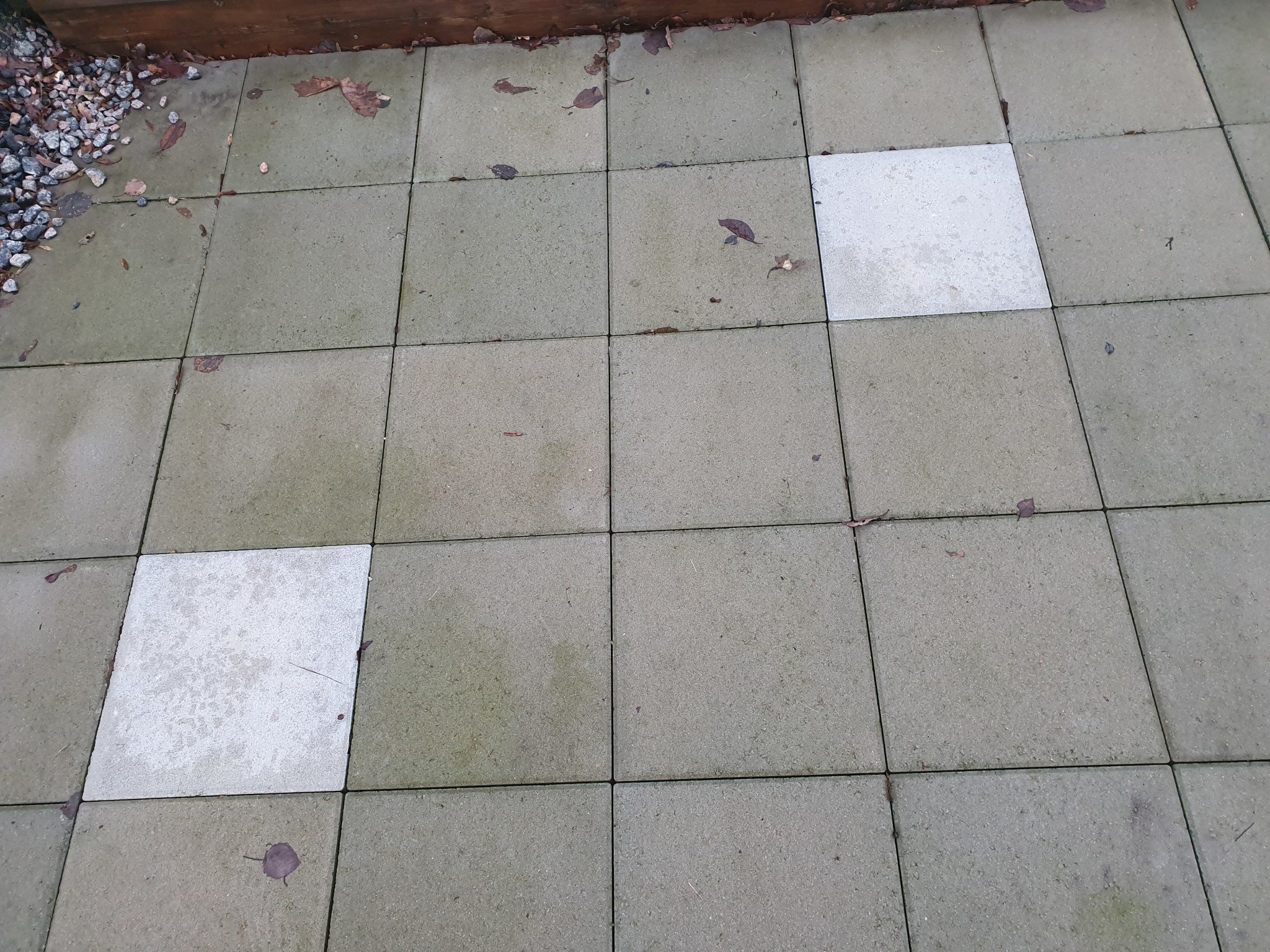 Bild på 2 betongplattor där jag testat Siloxan. De ser exakt likadana ut som alla andra när de är torra. Nu efter regnet är alla andra våta, men de behandlade är helt torra och har små fält av vatten som nästan verkar sväva ovanpå. Fälten ger de 2 aningens olika gråa nyanserna eftersom de reflekterar ljuset from himlen. Alla plattor är lika gamla och man ser tydligt påväxten av alger på de obehandlade.