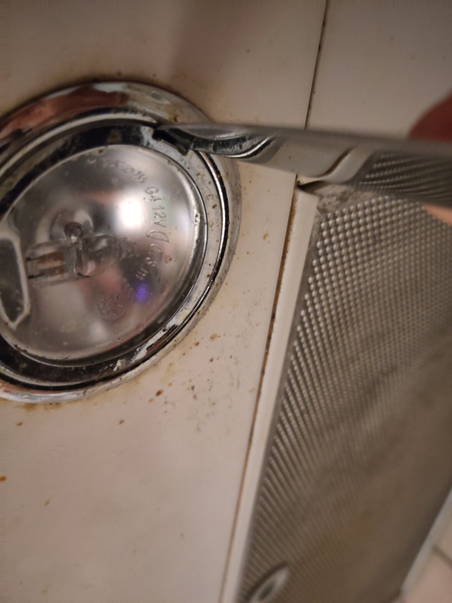 Ser ju ut som det kan behövas något specialverktyg med tre klor?? Har du provat att vrida den inre ringen med glaset? Det är en väldigt känslig lampa de där G4. Väldigt lätt att man skadar sockeln och det blir glappkontakt.