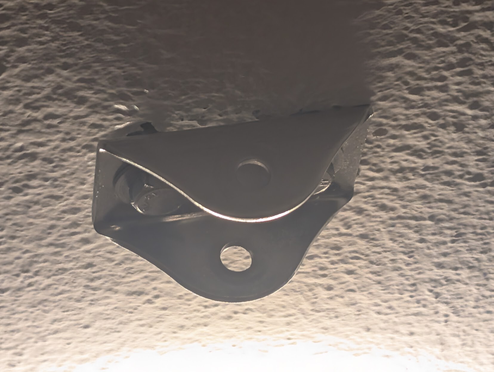 Knepigt värre är det, ser ut att vara en bult med gänga i en kona. Kan vara att det kommit betongdamm på gängorna och då skär det ihop. Du får försöka dra till lite extra på bultarna om det går. Någon hylsa sticker utanför betongen och kan gå att hålla med en större polygrip eller en lite rörtång, värre om hylsan är jäms med taket. Finns det ett lite mellanrum fäste och tak, kan det gå att med en kofot spänna så konan låser.