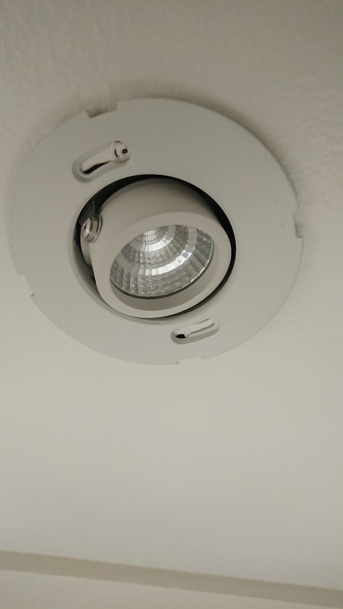 Monteringen ser lite skum ut. Ej använda skruvhål. Kanske sitter den med fjäderbelastade vingar, i så fall ska den bara dras rakt ner från taket.