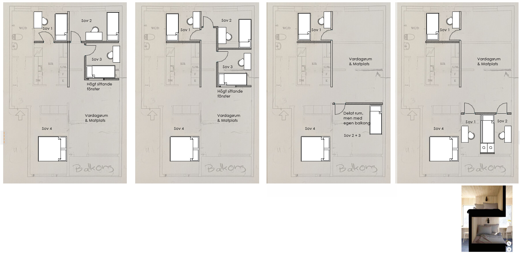 Tredje variant är minst jobb och kanske även bäst. Sovrum 2+3 blir får delas men har egen balkong. Du kan ju söka lite pinterest finns många fina exempel på dubbelrum.