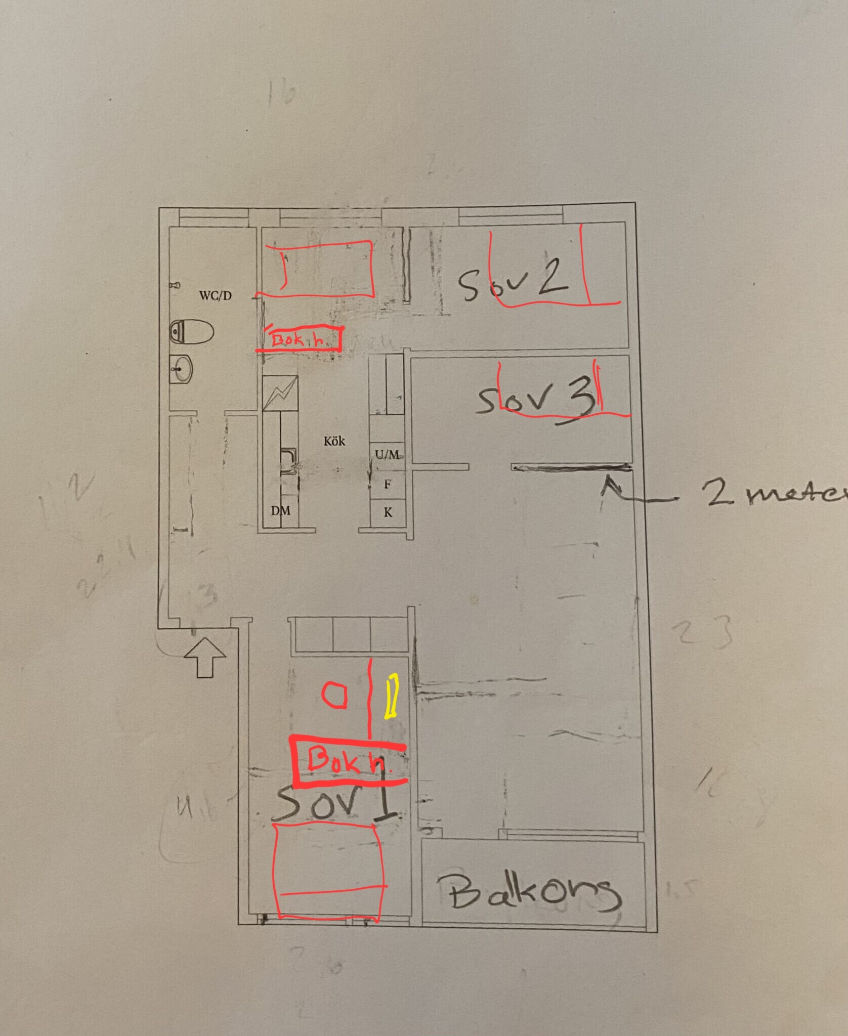 Den enklaste lösningen vore att låta killarna dela på det största sovrummet, låta tjejen ta det andra största och så tar jag det lilla utan fönster. Men jag skulle så gärna vilja ge dem ett eget litet utrymme. Mycket pga att 13-åringen är ganska problematisk och kommer bli jobbigt för brorsan att dela rum med honom.
