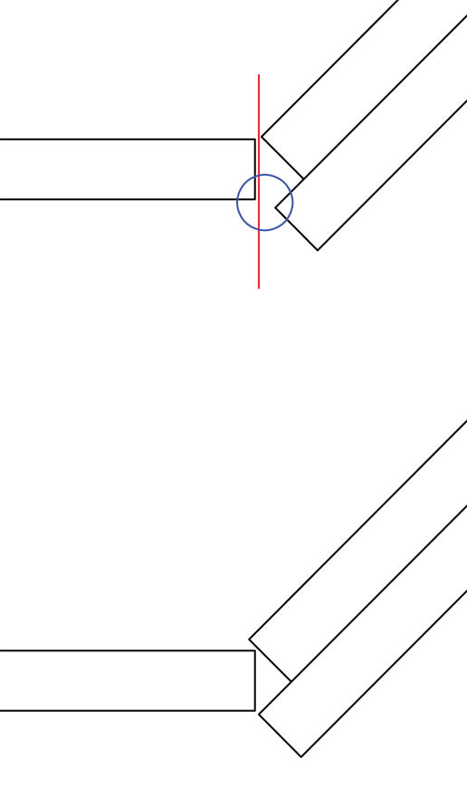 Jag tycker att det blir alldeles för stor springa vid dörren (blå cirkel nedan), dessutom blir det ju en springa med fri sikt in i skåpet (rött streck). Jag skulle hellre ha något i stil med den nedre bilden.