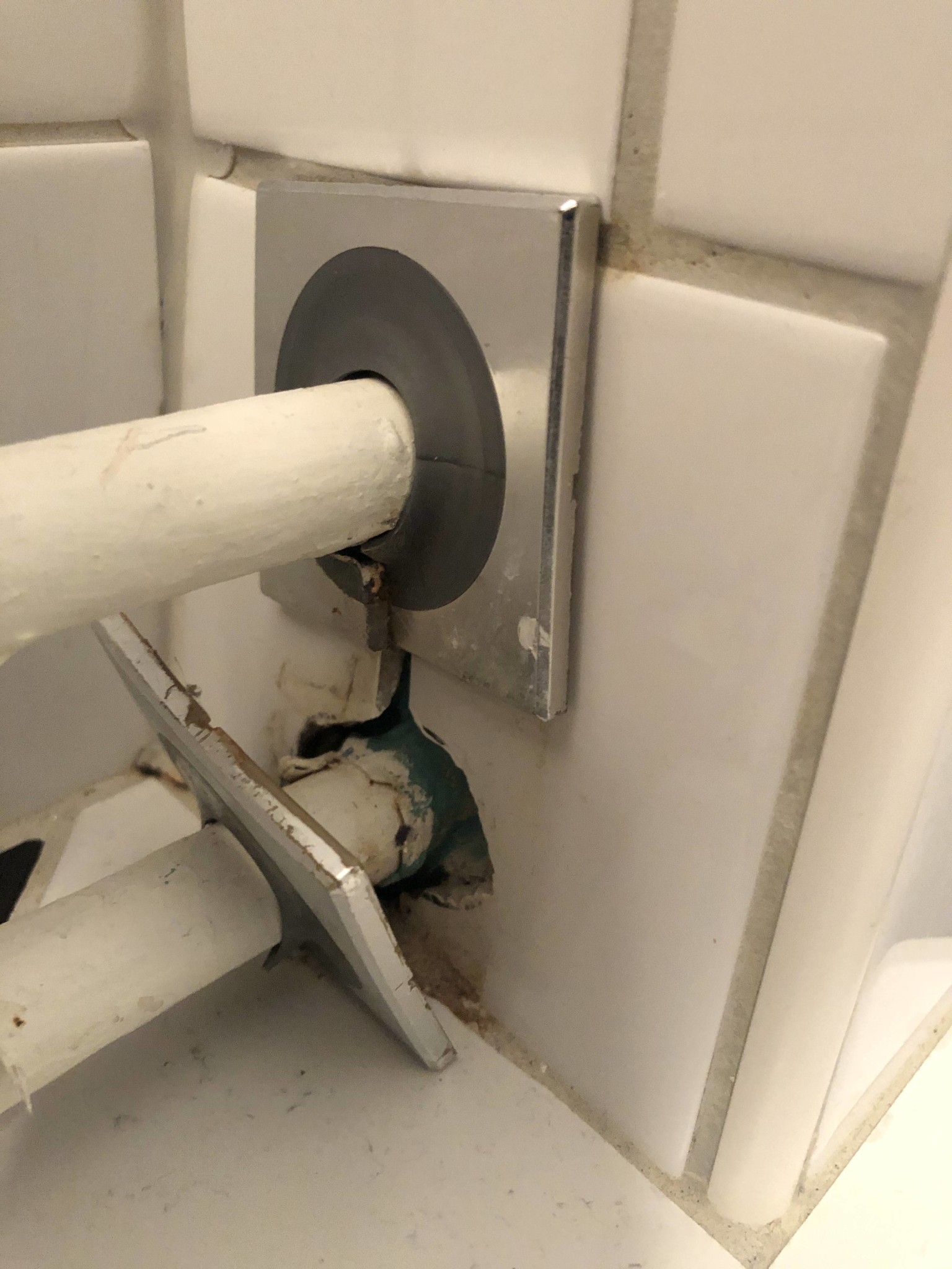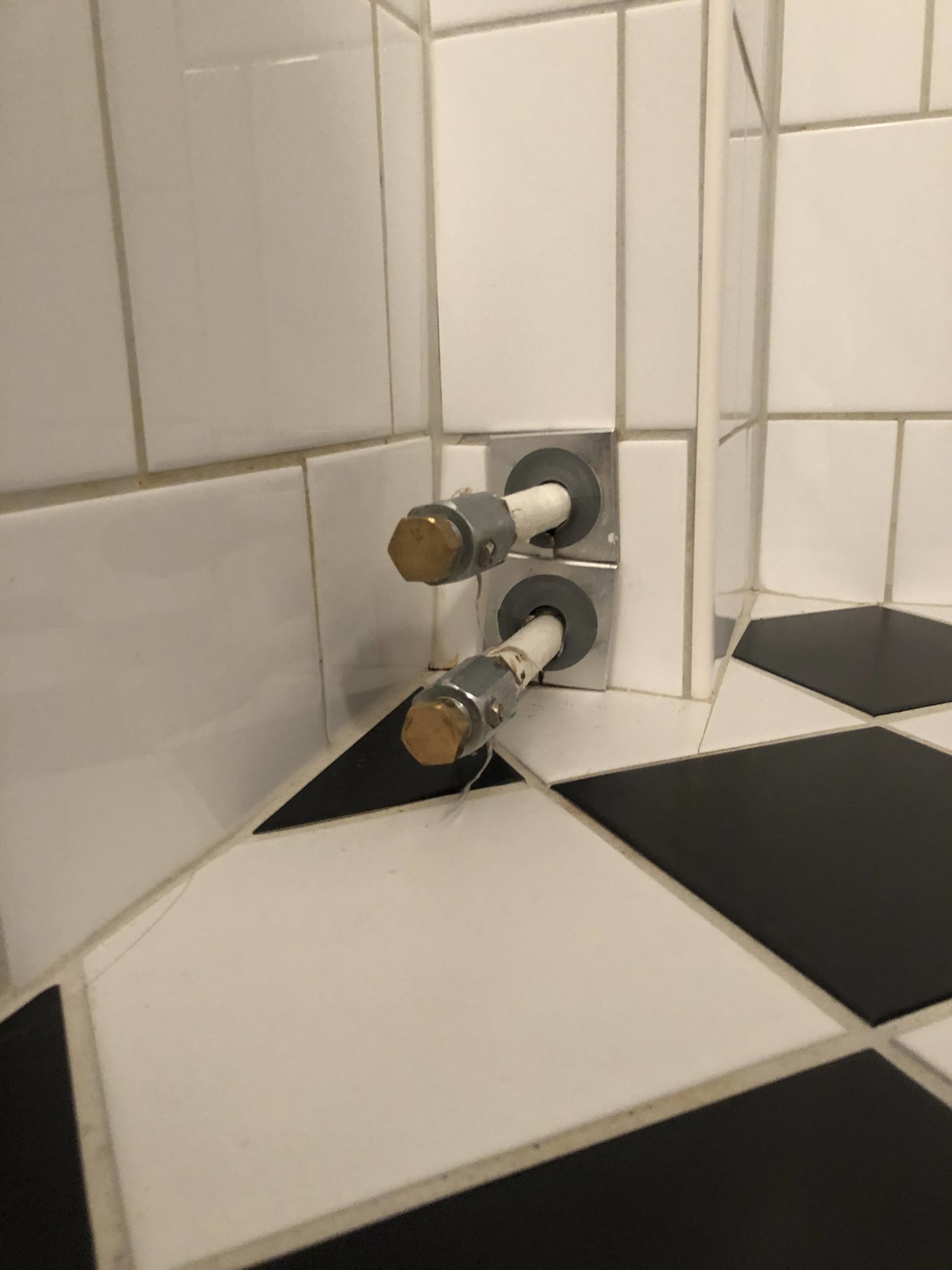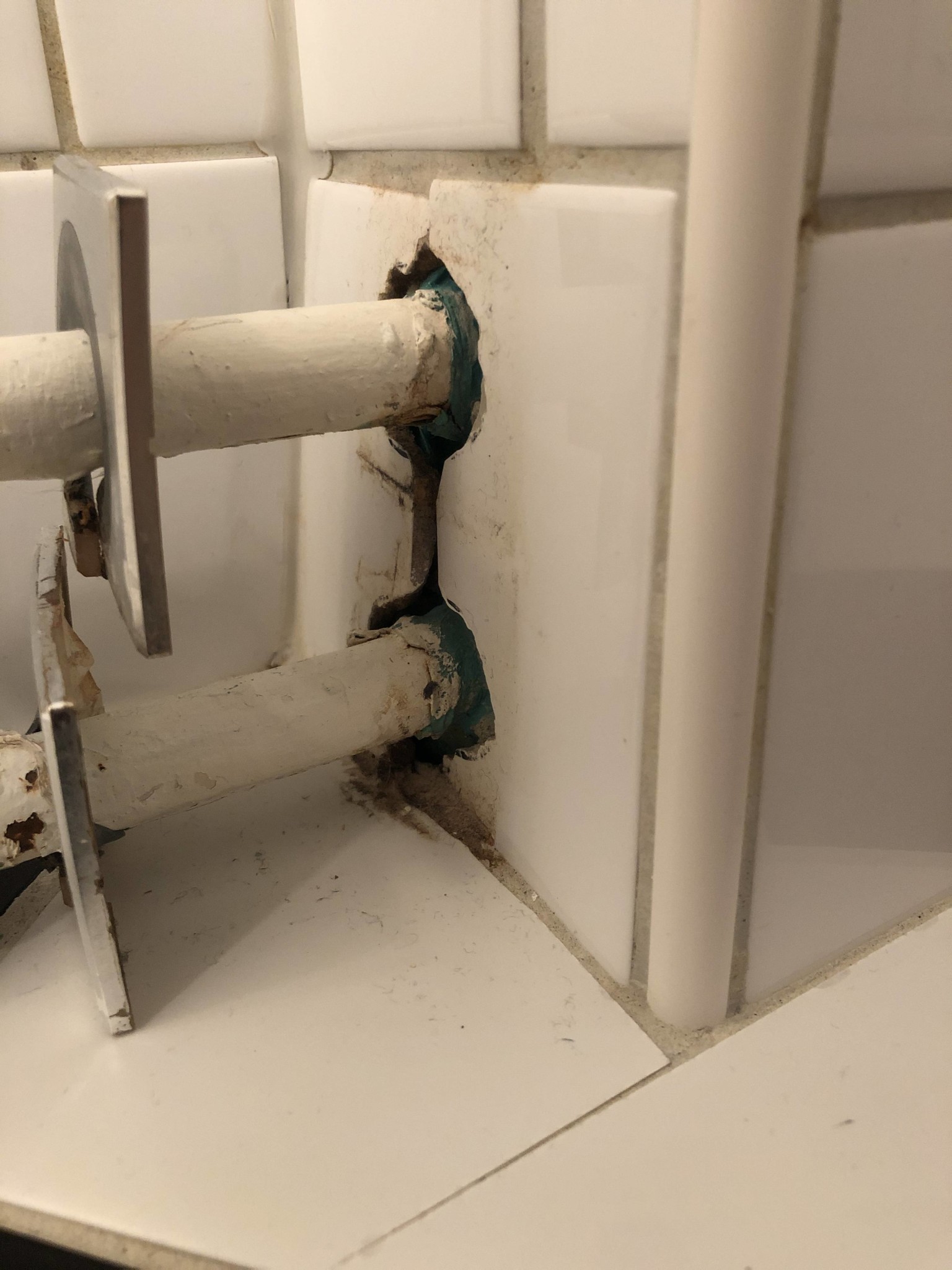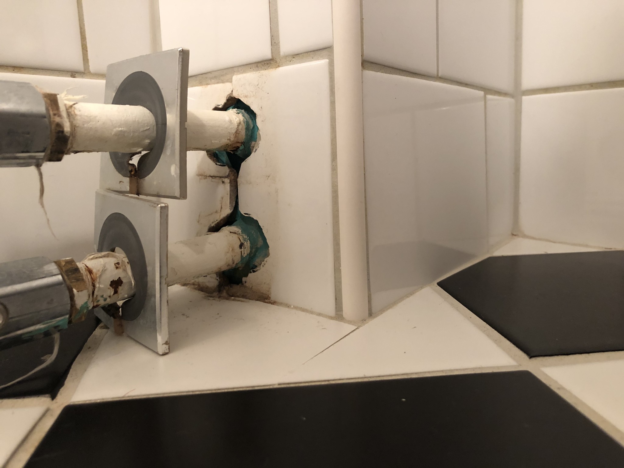 Vi har inte fått tillträde än men enligt avtal fått besöka med hantverkare för att planera renovering. Vid besök idag uppmärksammade entreprenören oss på att kakelplattorna var konstigt kapade ”så där gör ingen riktig plattsättare” samt att ”dom där rören är inte godkända.