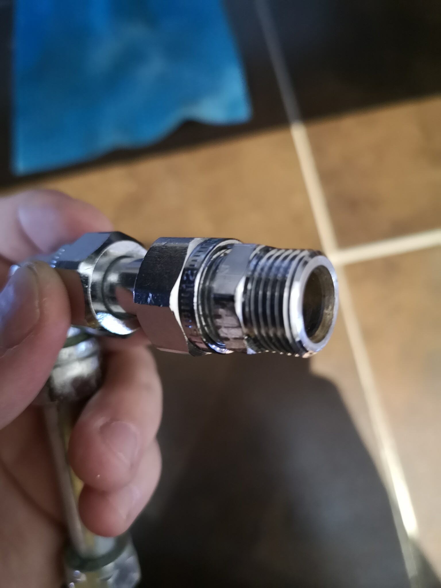 Den nya blandaren har pex-slang med G 3/8 mutter. Jag tänker koppla vid pilarna med nya R10 övergångsnipplar. Men jag känner mig lite osäker om det går, dvs om inte den befintliga kopplingen har klämring i sig.