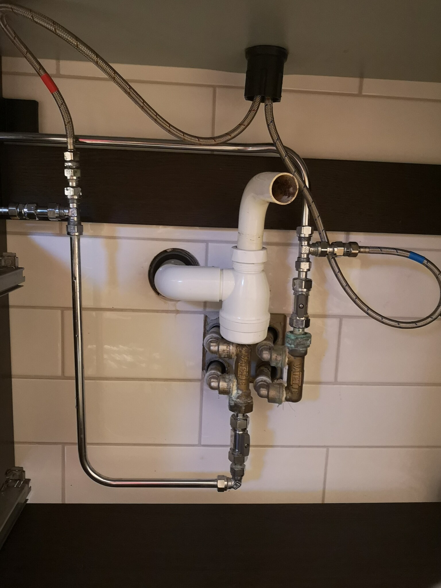 Man kan tycka att det är väl onödigt krångligt med så mycket rörkopplingar som kan läcka i framtiden, men vad vet jag. Ser det fackmässigt rätt utfört eller måste det ändras?
