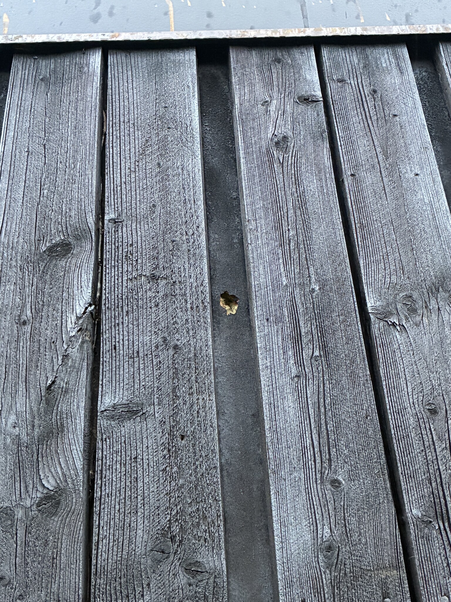 Vi har sista månaden ibland hört fåglar som ibland hackat i huset. Kikat lite men inte sett något men idag kom jag på en på bar gärning. Huset är i grunden oljehärdad masonit med brädor men med lite mellanrum som på fotot och de har hackat hål och plockat ut lite isolering. Detta har hänt på 6-7 ställen vad jag kan se.
