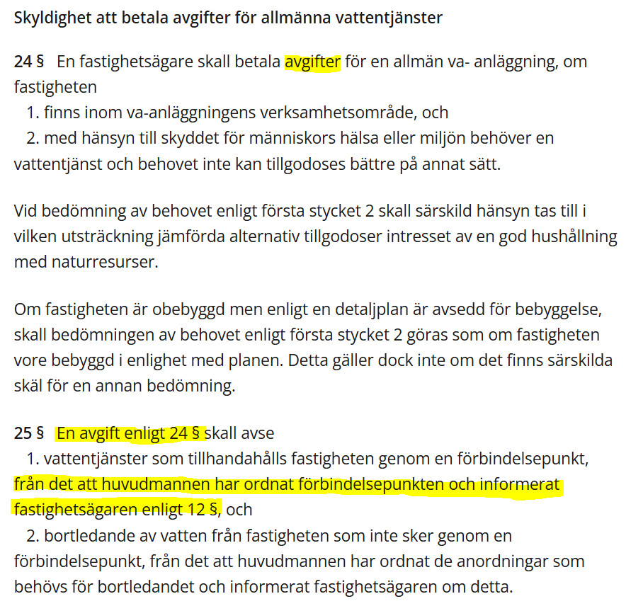 Klipp till November 2024 då jag får ett brev från kommunen, där de (i korta drag) skriver att de har inventerat och att de har information om att vi är påkopplade på vattenledningsnätet och att från 2024-12-01 kommer brukningsavgift för vatten debiteras.
