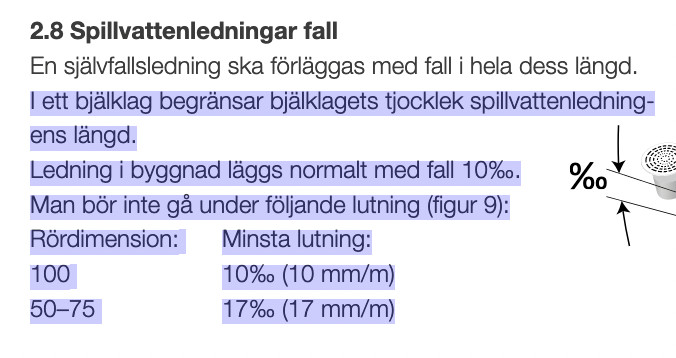 Pipelife verkar liberala i sina beskrivningar och anger minsta lutning på rören. Man hänvisar till Säkert vatten för vinklar som. Men man ger faktiskt en rekommendation om 1% fall:Rickard. skrev: