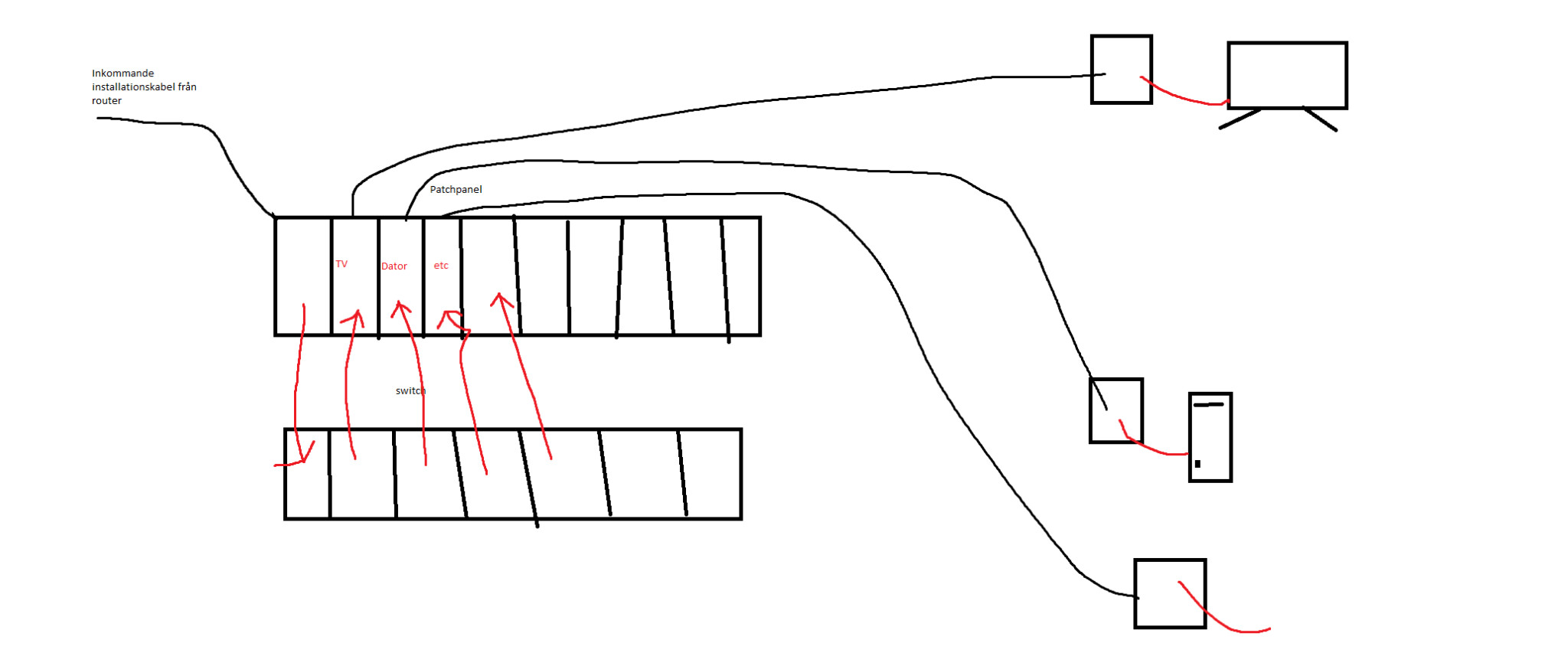 Du drar bara patchkabel från switchen in i patchpanelen där du har allt som kommer från installationskabel. Från patchpanelen drar du installationskabel till huset där den stoppas i ett uttag. Från uttaget har du patchkabel till datorn.O Ocuf skrev: