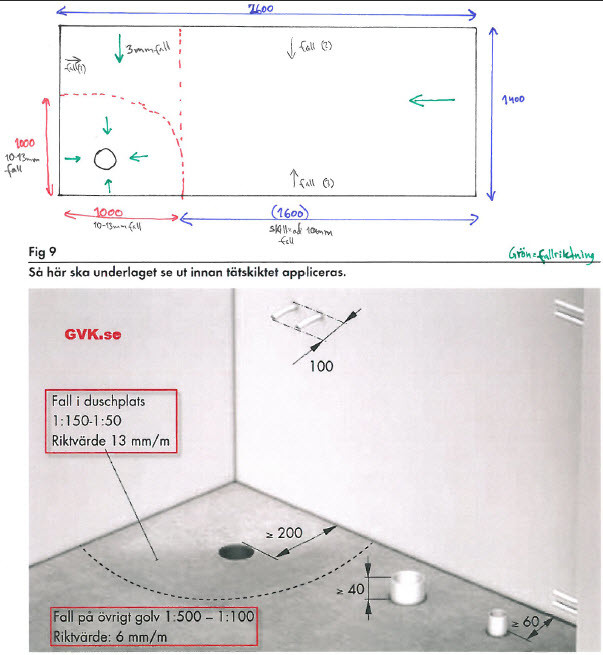 Går man strikt efter GVK så ska det vara ca 3 mm fall "ovanför" duschplatsen och avloppet på bilden. Är det lönt att få till det på det lilla området?