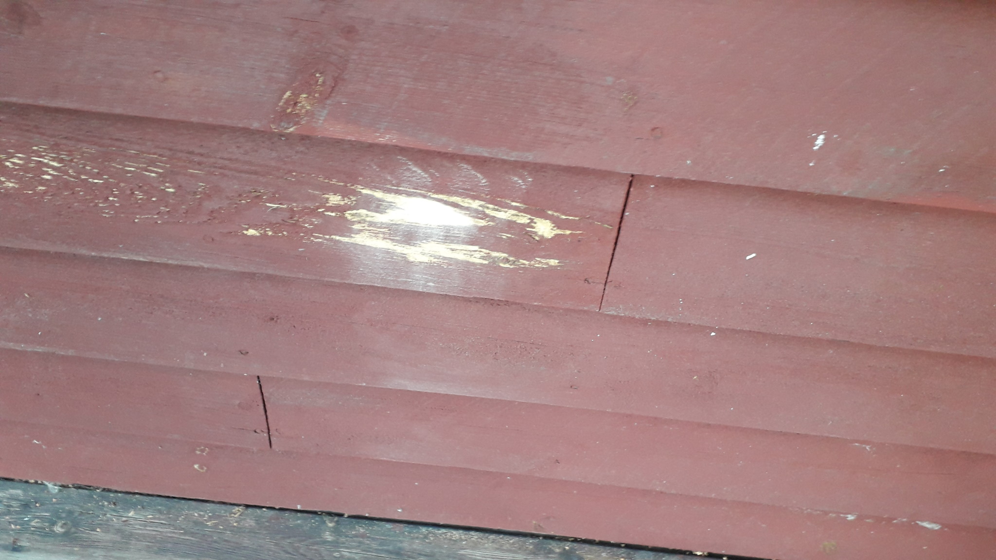 Panelen är målad med traditionell Falu Rödfärg, enligt ägaren ovanpå alkyd "brun färg".