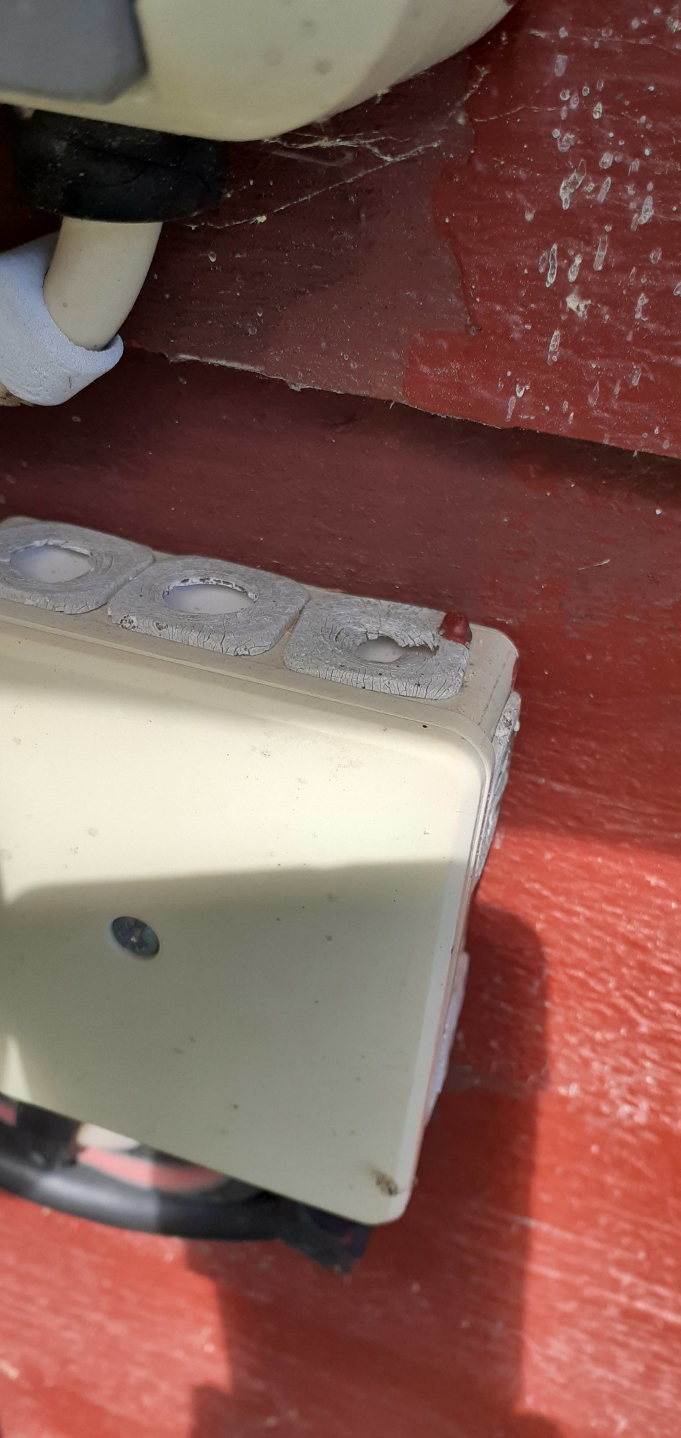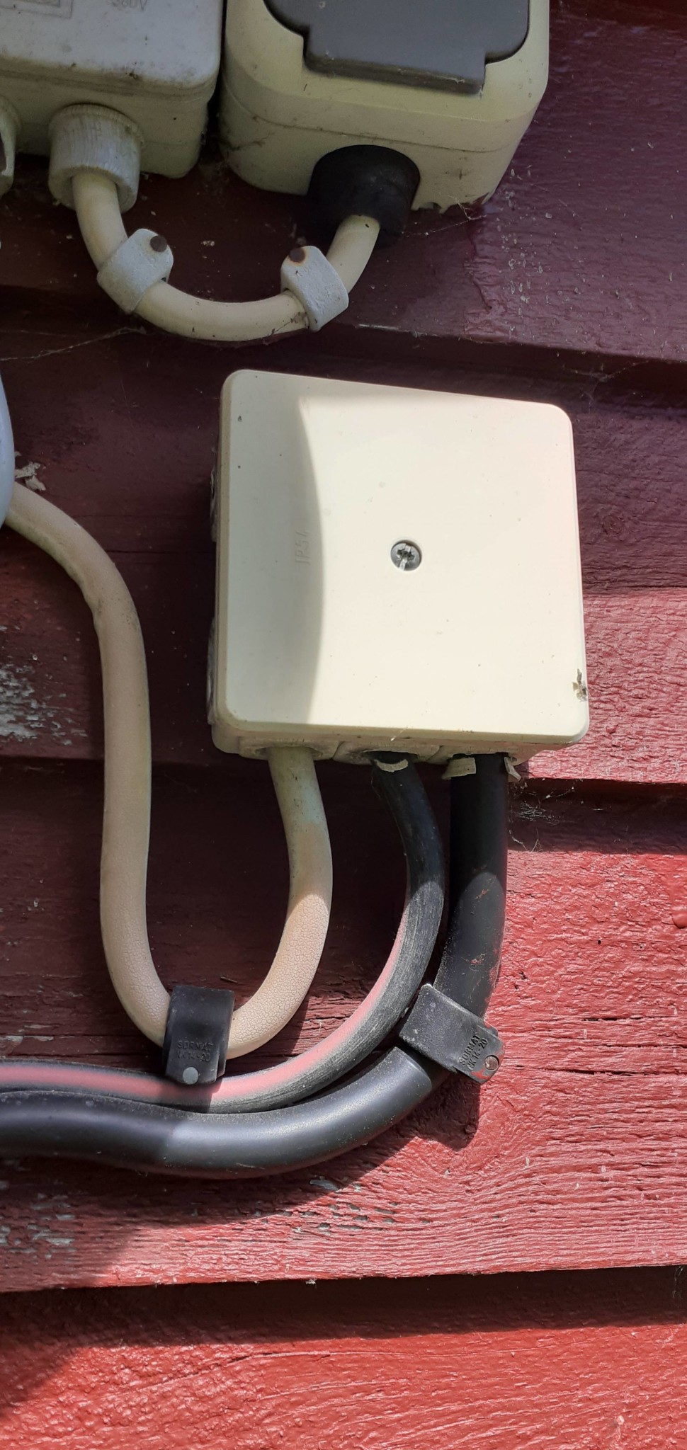 Se bild. Första bilden visar en dosa utomhus där den vita kabeln är från centralen. 1,5 mm². Den svarta är en 2,5 mm² vidare till en bod. En behörig elektriker (?) har nydligen kopplat in en kabel till en ny avloppsanläggning, röd/svart, i denna dosa. Rätta mig om jag har fel men visst måste en elektriker tillse att det är rätt och riktigt från central och även byta dosan när denna uppenbarligen är helt slut. .