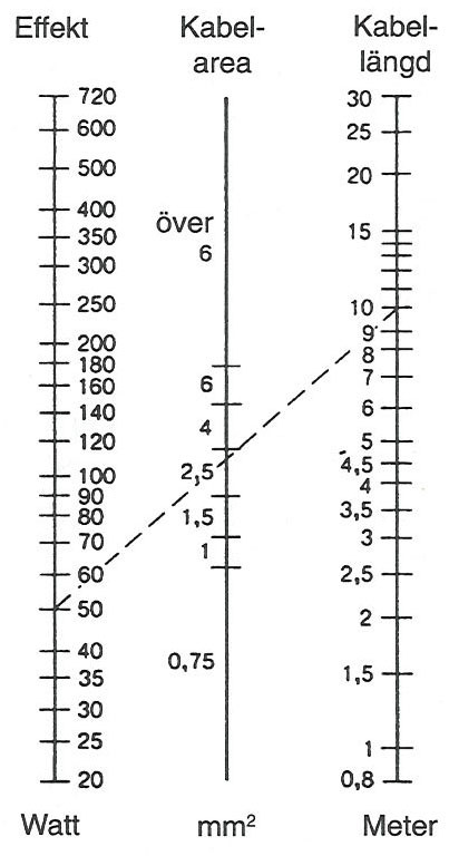 Kan du förklara vad detta nomogram visar? Om man tänker på den streckade linjen som binder ihop 60 W, 2.5 mm2 och 10 kabellängd? Får man för stor spänningsfall vid längre sträcka? Hur stor är tillåten spänningsfall i så fall? För vilken likspänning gäller det?Müssli skrev: