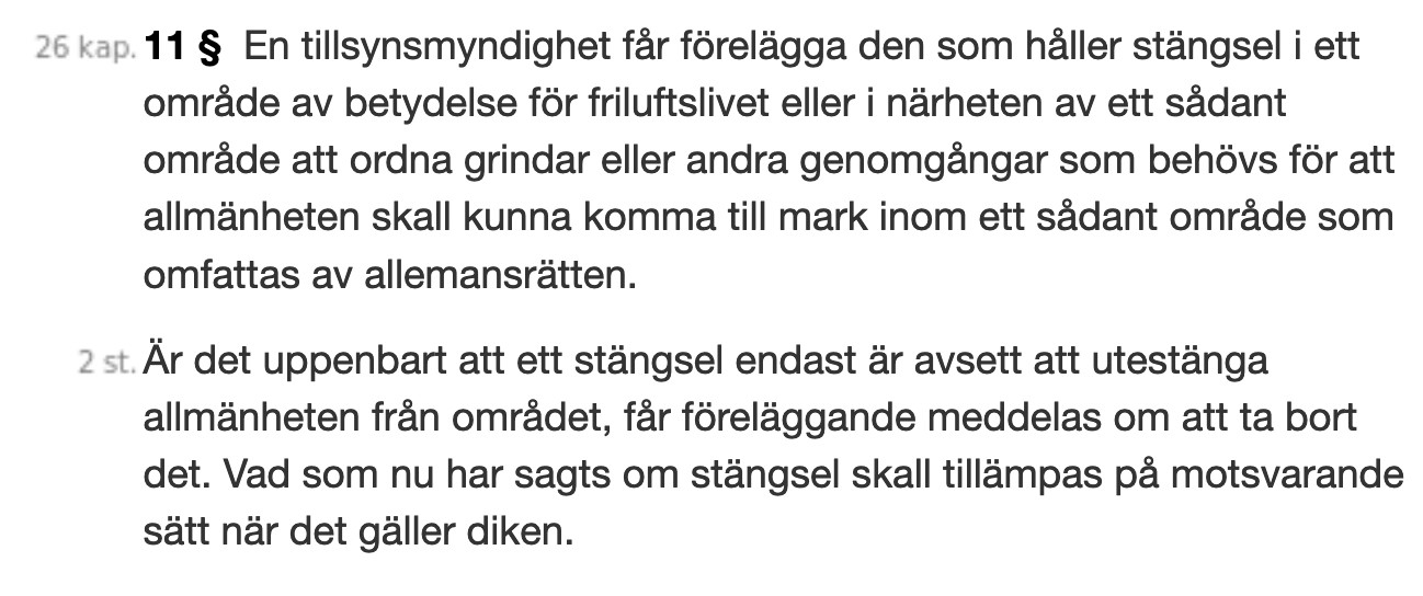 Men varför? Ge oss lagrum. Och hur kan det finnas hela städer fyllda av flerbostadshus med låsta gårdar? Det går inte ihop för mig.T TypRätt skrev:Ja här hållet jag med @Nötegårdsgubben ganska säker på att du enbart får hägna in det som räknas som hemfridszon om det inte är för djurhållning. Annars skall alla ha rätt att vistas där, har föreningen nu mark stor nog för att den inte ska räknas som hemfridzon får man inte utestänga allmänheten med skyltar eller staket.