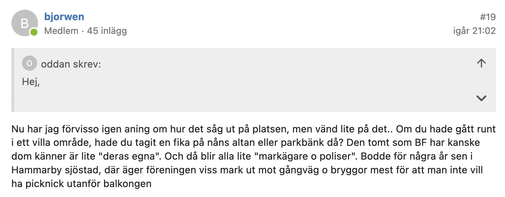 Alltså på riktigt!!! Vad är det för jävla lekstuga detta forum har blivit? Det är fan krig i Europa, och 90% av dom som skriver i denna tråd tjatar som barnungar om lagstöd för en BRf?? Och trådskaparen väljer att göra en grej av att han blev informerad om att bänken är "föreningens".. Höj er!!! Skaffa ett liv och lägg energi på saker som är viktigt!!!