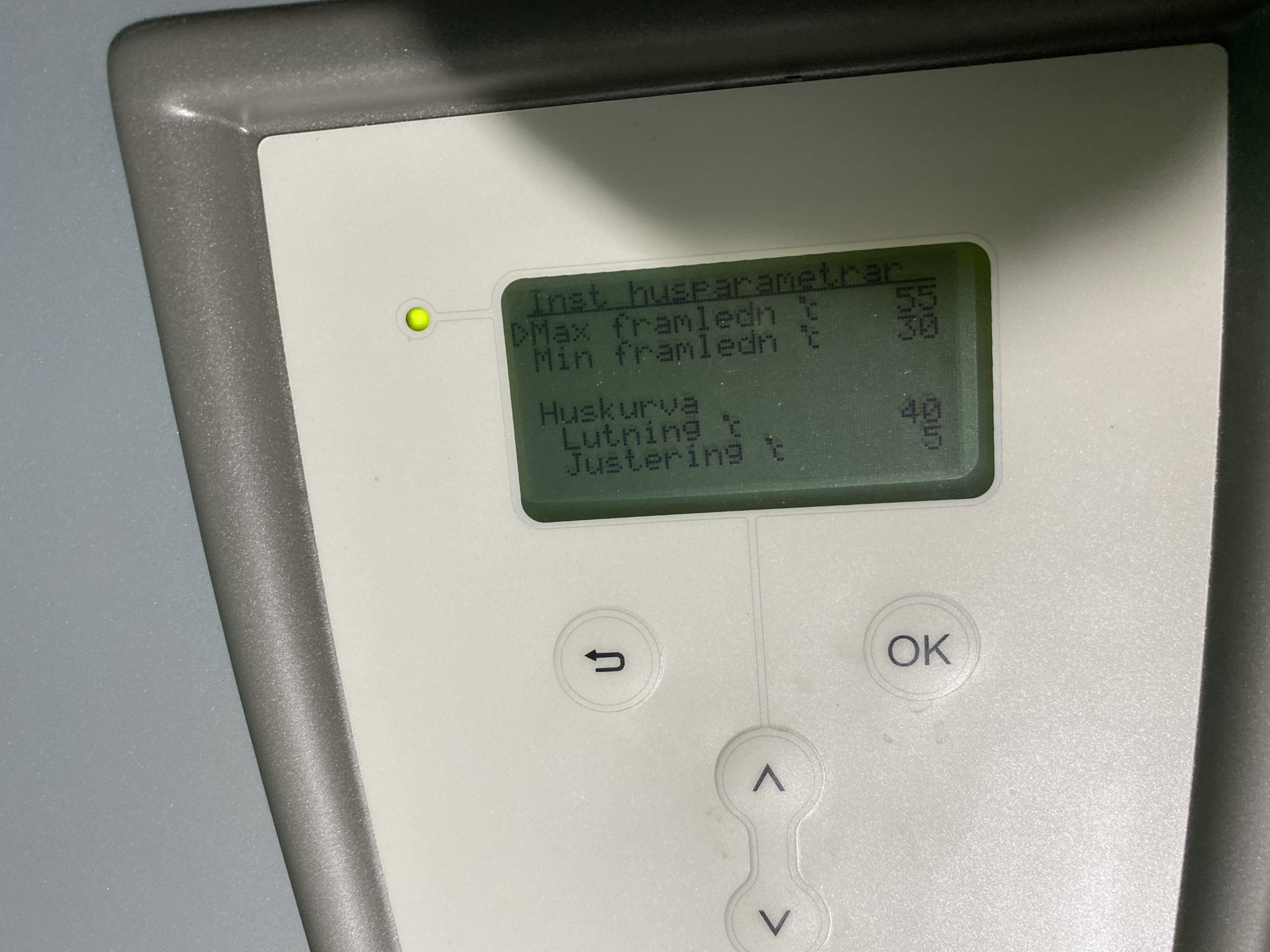 I jakten på kWh skruvade jag lite på pannan…som en effekt av mitt skruvande tycker resten av familjen att duschen blivit kallare…själv duschar jag snabbt och hinner inte märka det… jag tog en bild på de ursprungliga inställningarna men jag har dessvärre lyckats radera den…! Idag provade jag att höja Max framledning med 2C o justering med 2C…vi får se gissar jag. Något tipse?