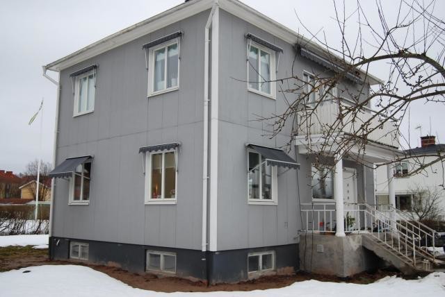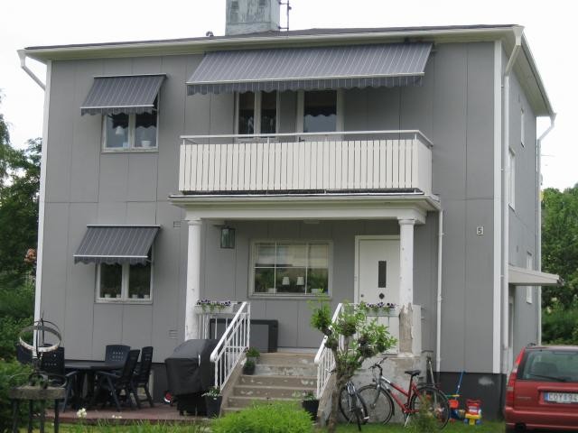 Markiser, färg på kasett, armar och tyg till ett vitt hus?