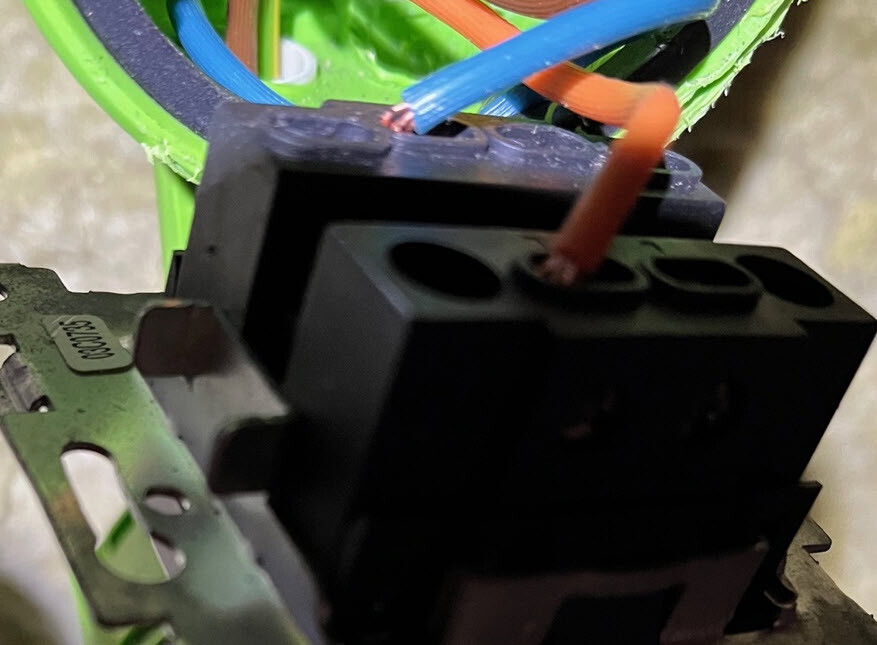 Första bilden är brytaren där det går en orange tändtråd till lampan samt in inkommande nolla ifrån vägguttaget,