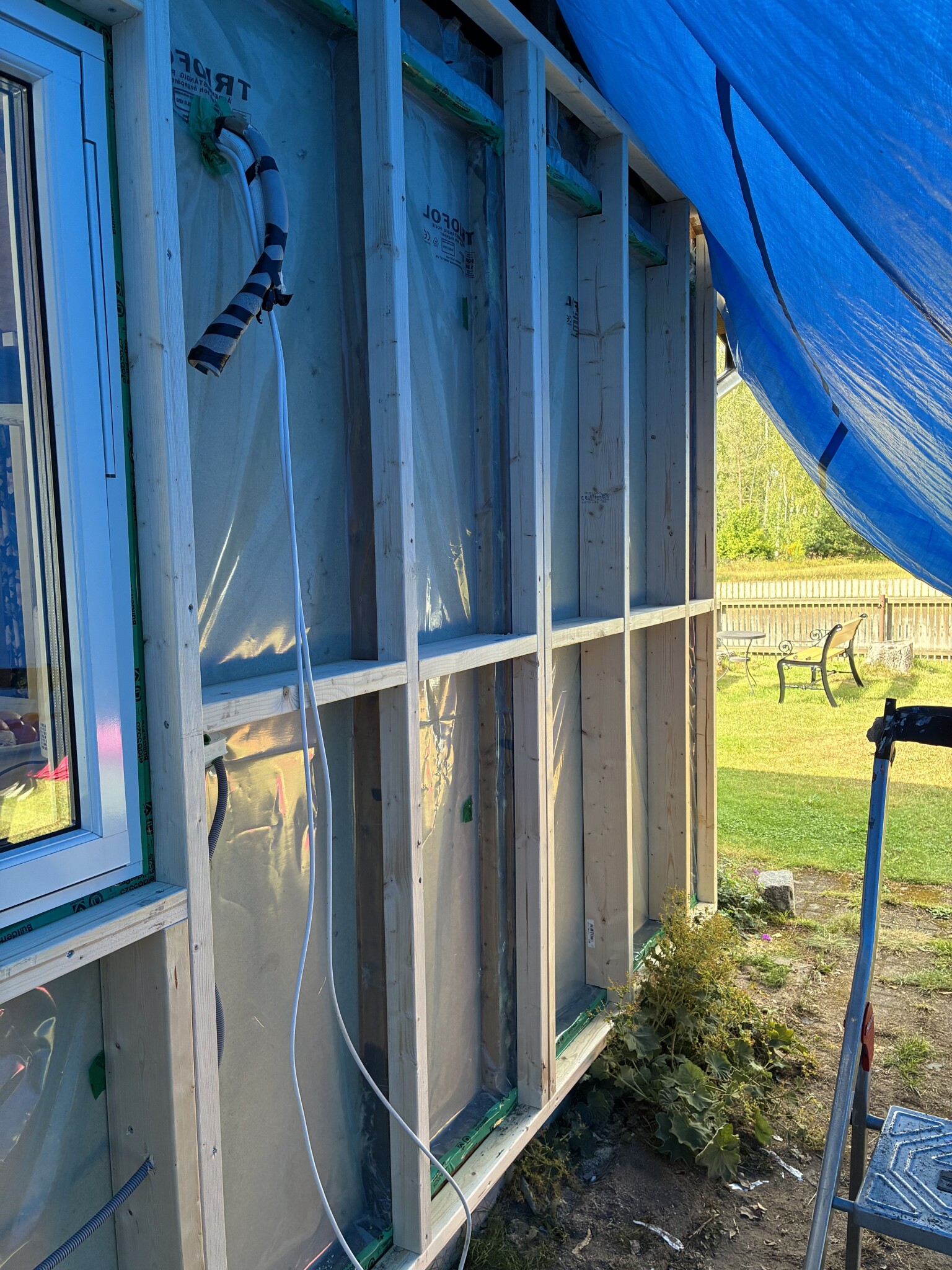 Om jag plastar in hela gaveln samt bef reglar och sedan monterar nya 145 reglar, 145isolering vindduk å fasad.