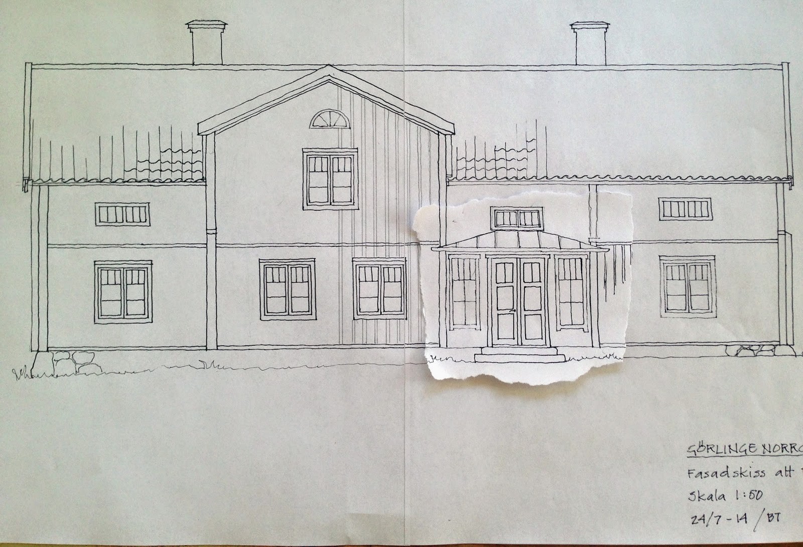 Jag tror att man har tagit en del av ett befintligt hus och lagt till det till den vänstra delen, skarven går precis till vänster om dörren. Vad som hänt då är att dörren hamnat för långt åt vänster och direkt till höger innanför dörren fins en trappa. Vi ritade en del förslag i början som gick ut på att sätta verandan mitt framför frontespisen men det gjorde för stor påverkan på planlösningen och dessutom är vår ambition att i så stor utsträckning som möjligt inte förvanska huset.